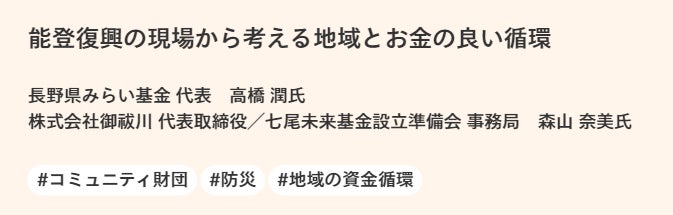 年明けに発生した能登半島地震そして、9月に発生した能登豪雨と今もなお能登の方々は大変な状況の中、前を向いて取り組んでいるリーダーたちも大勢います。そうしたリーダーたちの活動を支えるための資金を循環させ、地域内の必要な場所に届ける役割を果たしているのがコミュニティ財団です。今回は、長野県みらい基金代表の高橋潤氏をゲストにお招きし、もしもの時に備える取り組みだけでなく、どのように地域のコーディネーターやプレイヤーたちと連携体制をつくっていくのか、能登での実際の出来事から今後の可能性を検討していきます。