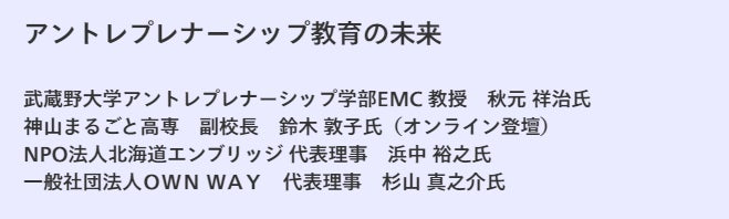 「人口減少」「少子高齢化」「AIの発達」「グローバル化」「VUCA」、これからの未来を担う若者はこれまでとは違った時代を生きていくこととなります。このような時代では自ら未来を切り拓く「アントレプレナーシップ」の重要性が高まり、公教育・行政・民間とさまざまな機関によるアントレプレナーシップ教育が広がっています。このセッションでは、それぞれの現場での事例や設計思想を共有していきながら、「これからの時代のアントレプレナーシップ教育のあり方」を考えていきます。