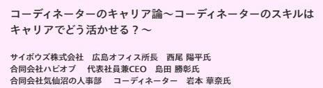地域でチャレンジを生み出す上で欠かせないコーディネーターという存在。多様なスキルが求められることから、様々なキャリアを歩める可能性があります。今回は、コーディネーターを経て多様なキャリアを築いているゲストをお呼びし、キャリアの中で得られること・その先に描けることを考えます。コーディネーターに興味がある方や若手コーディネーターの方、これからどうキャリアを築いていくか迷っている方、一緒に考えましょう。