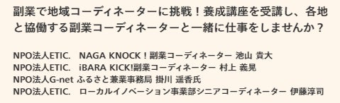 各地で地域コーディネーター役が足りないと言われています。一方で、今は都市部に住み、本業の仕事もしっかりしながら自身の1つの副業として「地域コーディネーター」という役割に魅力を感じて挑戦を続ける社会人も多くいます。地域コーディネーター養成講座を受講後、各地で地域コーディネートの仕事に副業的に取り組む「副業コーディネーター」と、地域に根を張り活動を続ける「地域コーディネーター」でどのような協働が出来るか、双方のゲストと共に、取り組み事例も交えながら今後の展望と課題について議論をします。