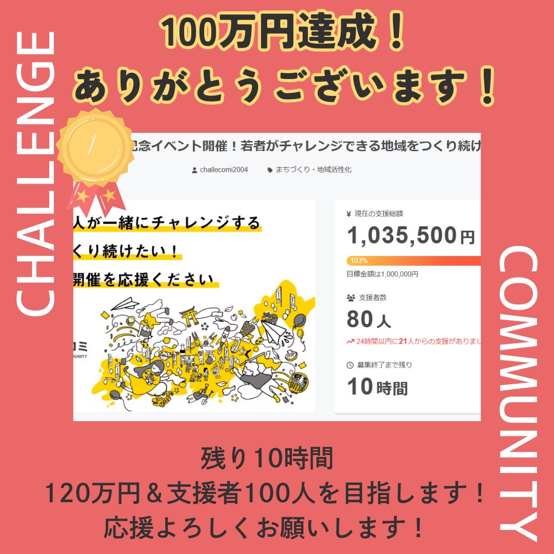2024/10/31 15:15チャレンジ・コミュニティ・プロジェクト事務局の瀬沼です。皆様のご支援で残り10時間でプロジェクトの目標を達成することが出来ました!ご支援いただき、本当にありがとうございました。ご支援いただいたお一人お一人のお名前を見るたび、お金だけではなく皆様からの思いも受けとらせていただいていました。金額以上に皆様から頂いたメッセージやSNSでのシェアなにより今回このプロジェクトを知っていただき、80名ものみなさんから支援を頂けたこと自体が、私たちにとってはとびきりの応援でした。本当にありがとうございました。ときに挫けそうになる心を支えてくださったのは間違いなくお一人お一人のご支援と一緒にいただいた応援のおかげです。残り僅かな時間となりますが、皆さんからの応援を糧に、120万円&支援者100名を目指して最後まで取り組んでまいります。プロジェクト終了後、支援を頂いた皆様には順次リターンの対応をさせていただきますので、お待ちいただけますと幸いです。また、既に多くの皆様からお申し込みも頂いておりますが、11月9日(土)の会場でも皆様とお会いできますこと楽しみにしております。当日の詳細はこちらからご覧ください。https://challenge-community20.studio.site/そして当日会場にお越しいただけない方にも少しでも当日の様子をお届けできるよう、皆様から頂いたご支援をもとに当日までの準備を進めてまいります。ぜひ最後まで応援いただけると幸いです。 もっと見る