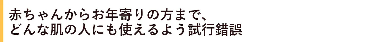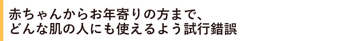 赤ちゃんからお年寄りまで、また辛い肌トラブルを抱える人にも、全ての人に使ってもらえるよう、試行錯誤を重ねました。時にはわざとドライヤーの温風を自分の顔に当てて乾燥状態を作ったり、体のどこかに傷口を見つけたら塗ってみて反応を試したり。どんな状態でも赤みや腫れが出ないか、ずっとそれを追い続けていたら、3年が経っていました。
