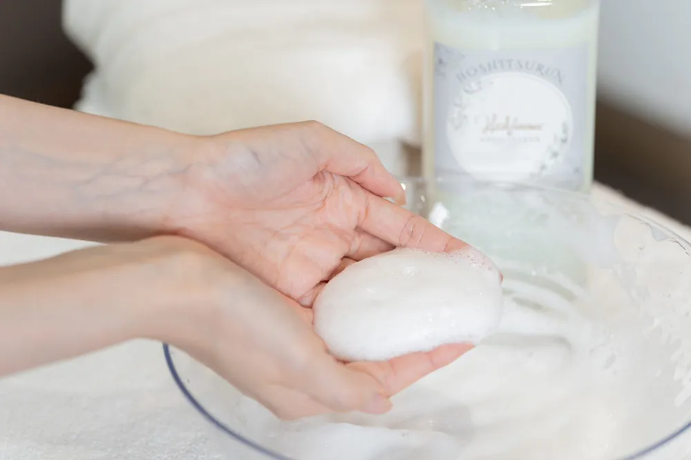 ほしつるん ソープで追及したのは、相反する性質を持つ洗浄力と保湿力の両立。洗浄力を高めると保湿効果が失われ、その逆もしかりで、ちょうど良いバランスを取るのが至難の業でしたが、汚れ落ちの良さとしっとりした洗い上がりを実現しました。