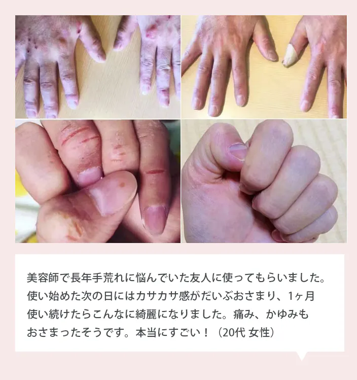 父の肌トラブルに加え、私自身も美容師時代からのひどい手荒れが全身にまで広がり、ステロイドの飲み薬、塗り薬、保湿剤を使ってもいっこうに改善しない状態でした。1日中ずっと保湿のことが頭から離れず、ドラッグストアに行って手当たり次第に保湿剤を試しては失敗の繰り返しでした。