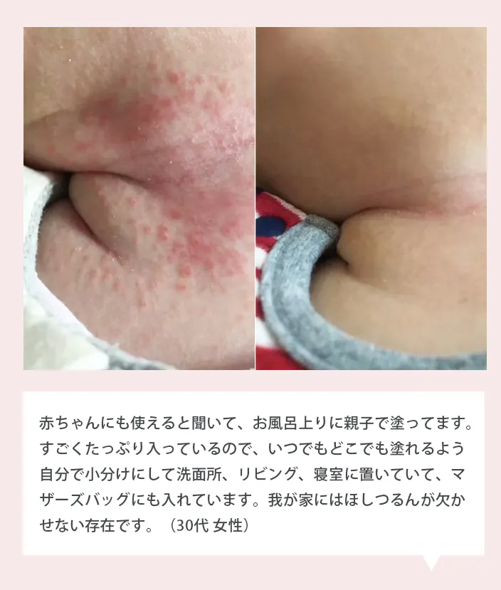 ほしつるんは低刺激設計で赤ちゃんからお年寄りまで家族全員で使え、朝夕の洗顔・スキンケア、バスタイムのケアもこれ1本でまかなえます。例えばお風呂上りに赤ちゃんのケアをした後、そのまま自分の顔にも塗れるから、時短ケアにもぴったりです。
