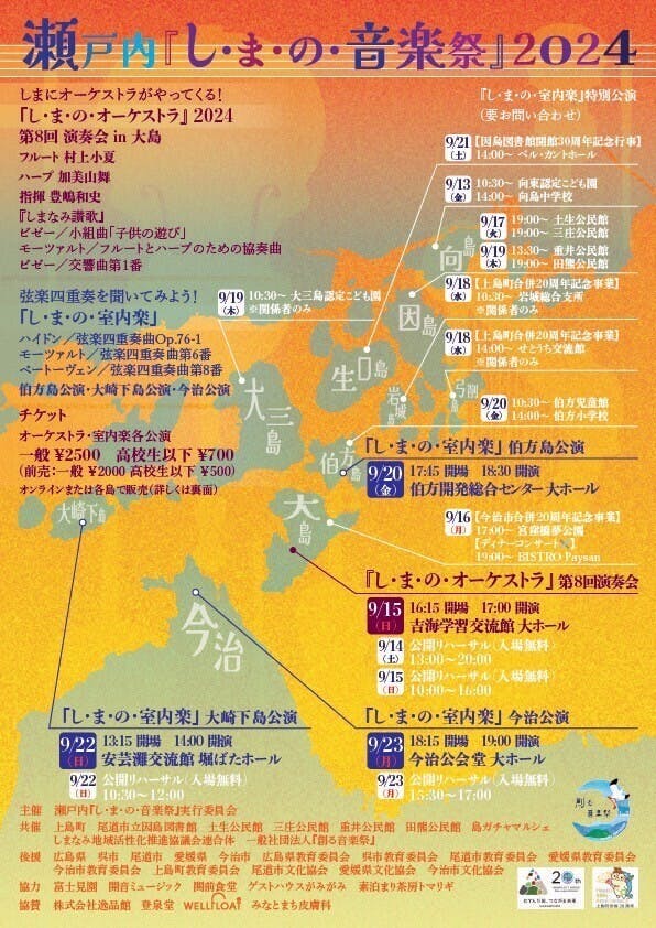 瀬戸内『し・ま・の・音楽祭』は、「瀬戸内海の"しま"に生の音楽を届けたい!」をモットーに、毎年9月に瀬戸内海の各島でオーケストラや室内楽の演奏会を行う企画です。