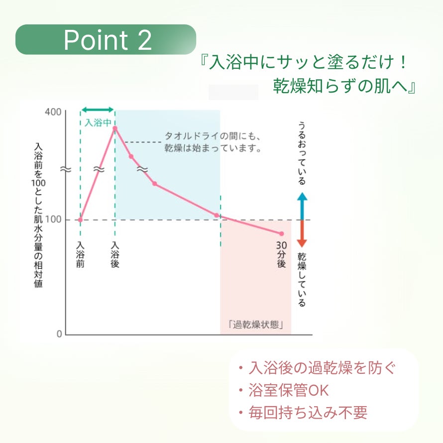 入浴中の肌の乾燥から入浴後の肌の乾燥まで幅広く、肌の乾燥から守ってくれます。