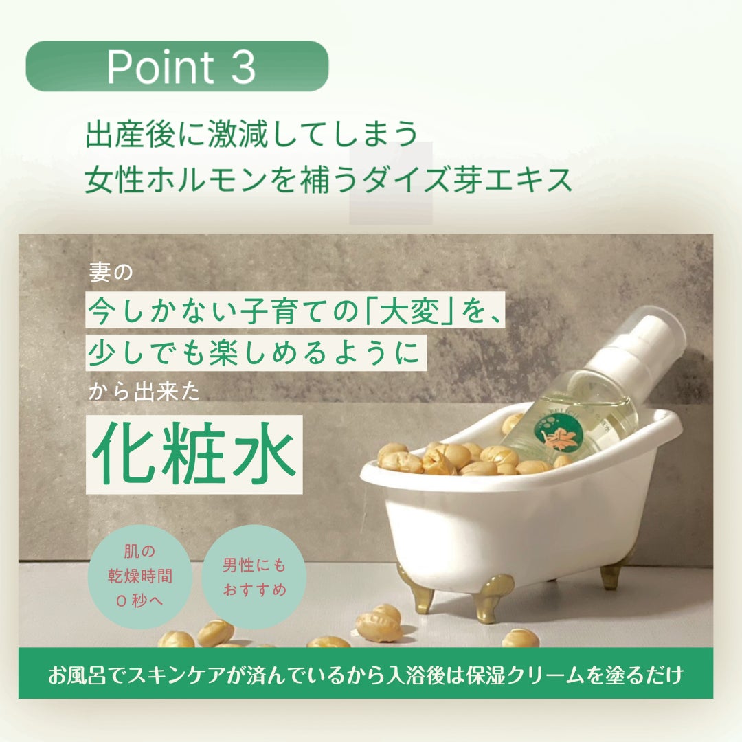 お風呂場で濡れたままの肌に使える化粧水で、全身を洗い終わった後にスキンケアをおこない、たった数十秒でスキンケアが完了。入浴中から入浴後の肌の乾燥が気にならず、『自分の時間が取れないママ・パパに少しでも余裕を持ってもらえるように。今しかない子育ての”大変”を少しでも楽しめるように。』との想いで開発しました。