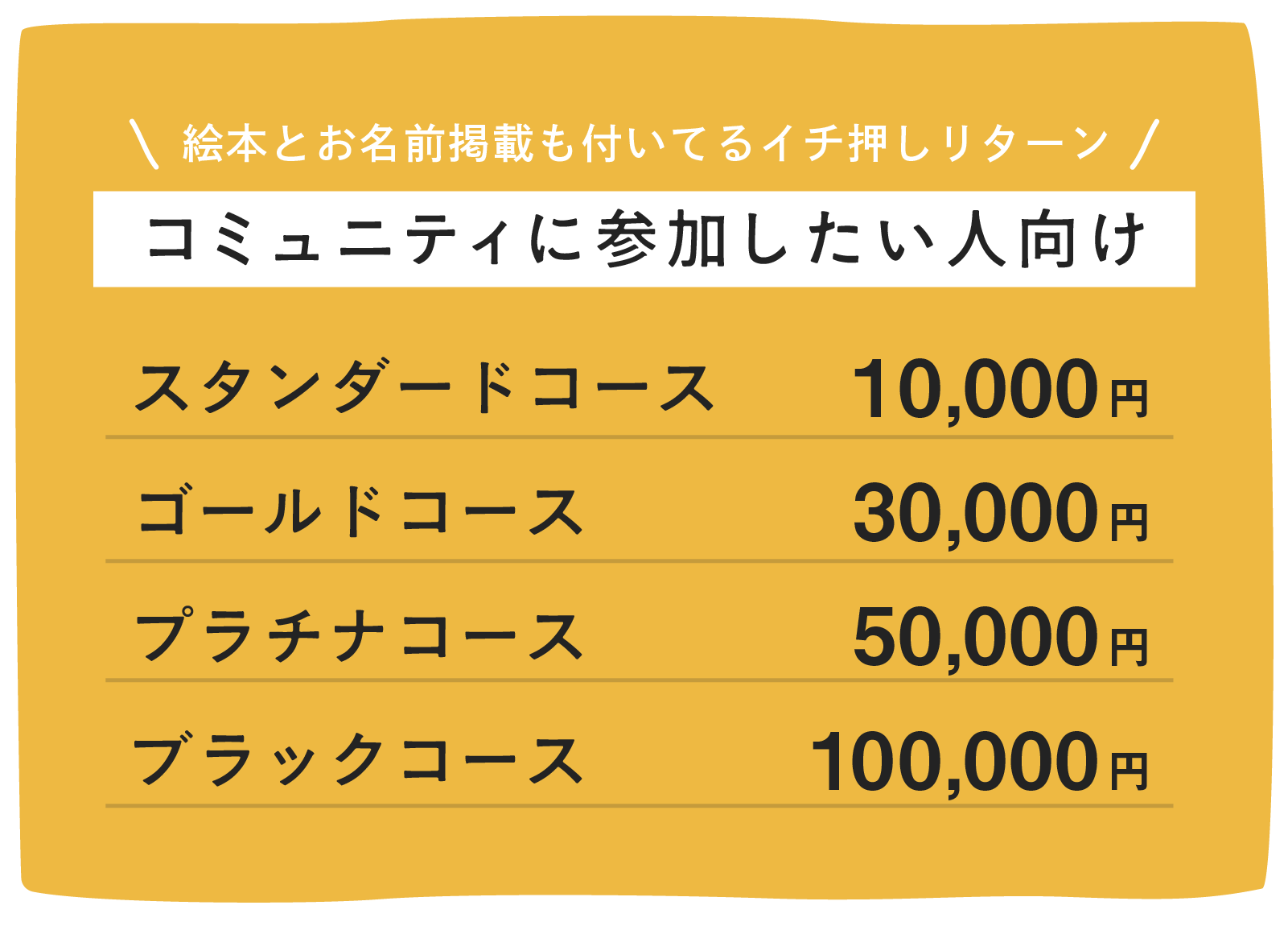 みなさまには、ユニバーサルツーリズムを広く伝えていくための基盤を立ち上げる初期メンバーとなるコミュニティサポート会員権やサイン入りの絵本などをリターンとしてご用意しております。