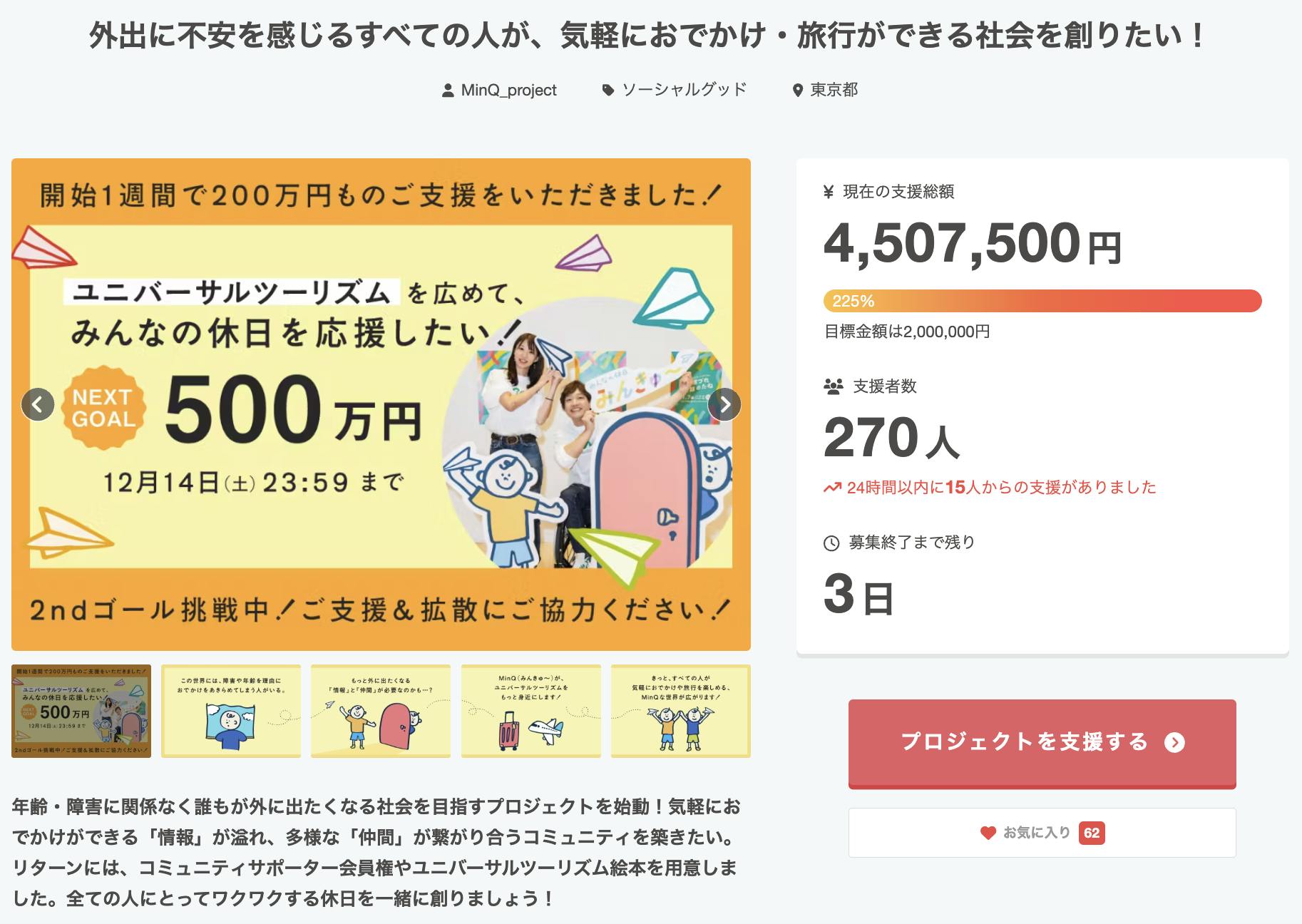 みなさま、本当にありがとうございます。450万円7500円/270人突破。後3日、走り続けます。