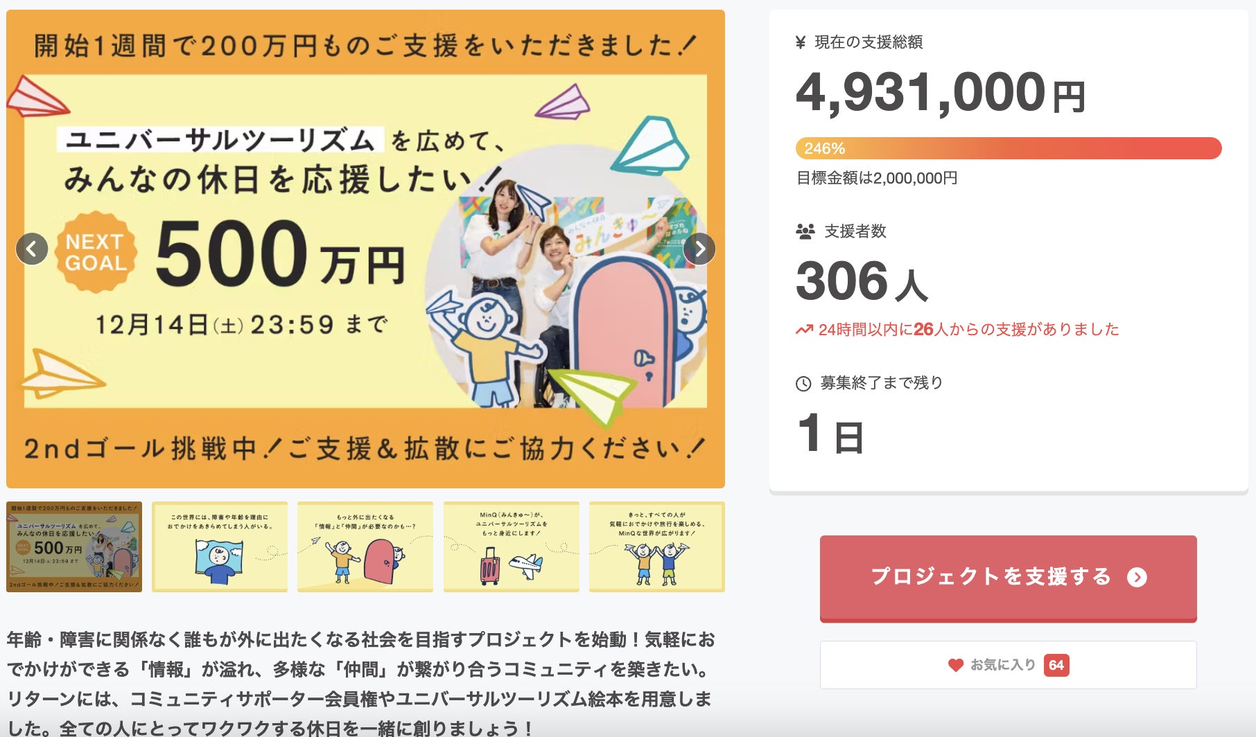 残り1日でなんとか500万円の目標を突破したく、一緒にプロジェクトを盛り上げていただきたいです