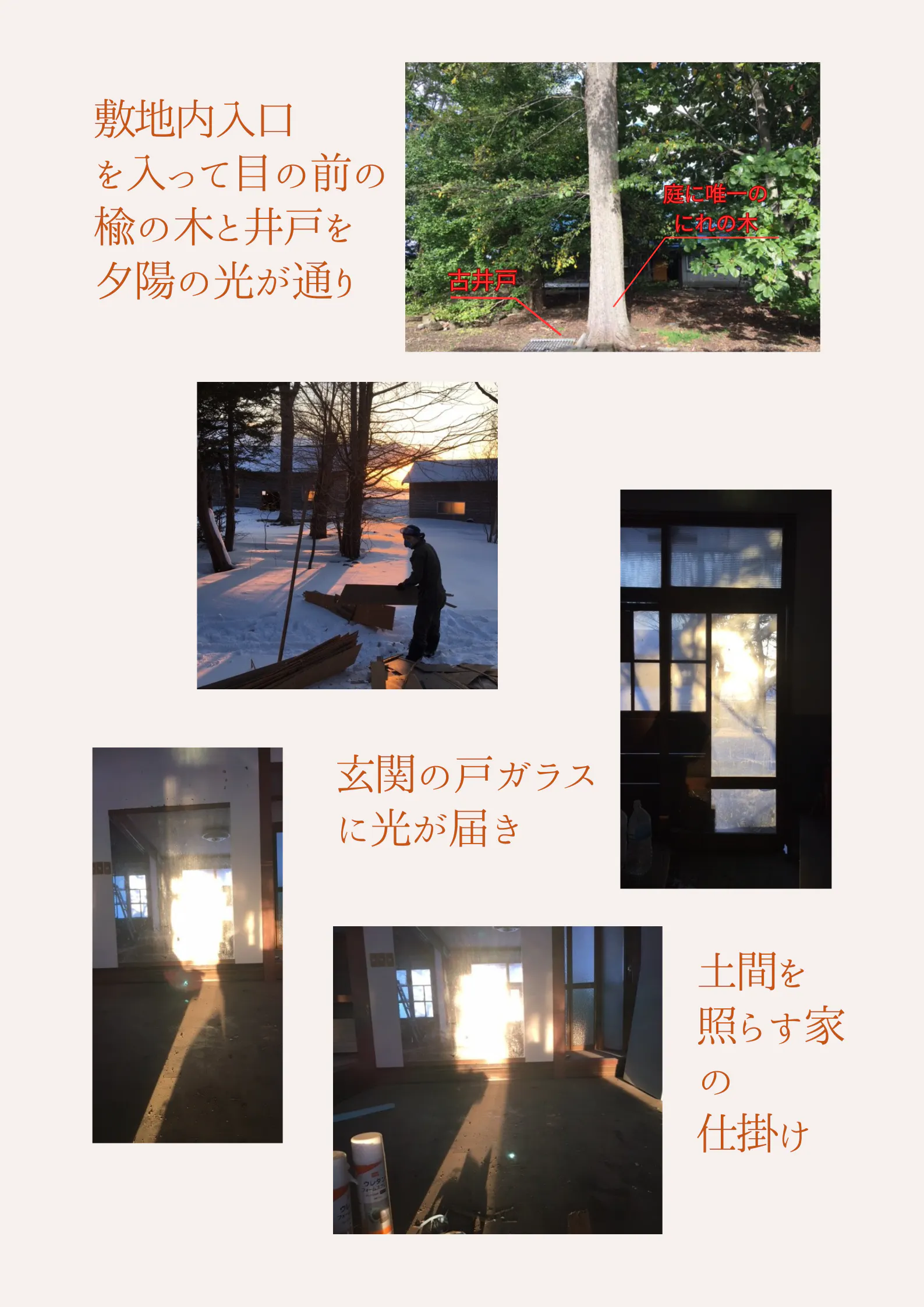 他にも、夕陽の帯が土間にある大きな姿見に反射して土間を照らし出すという、大工さんによる粋な仕掛け