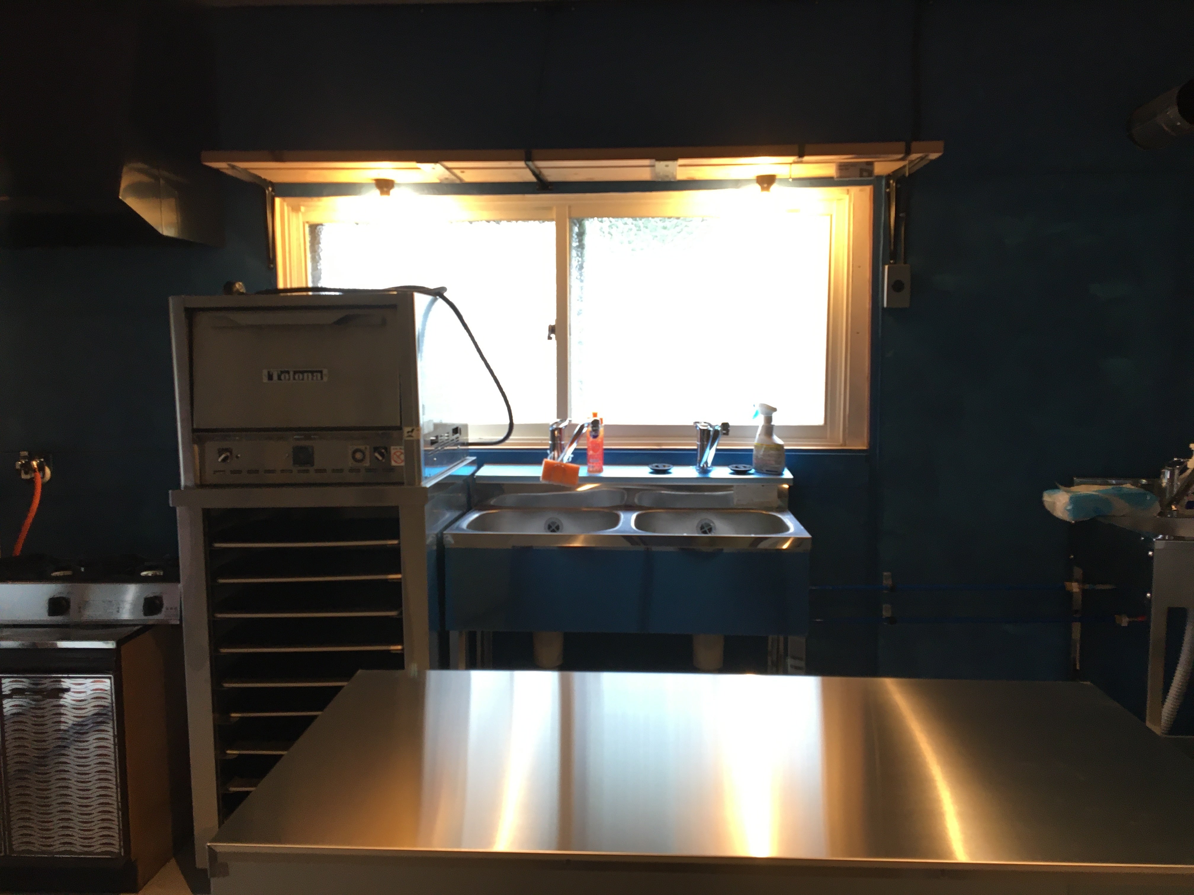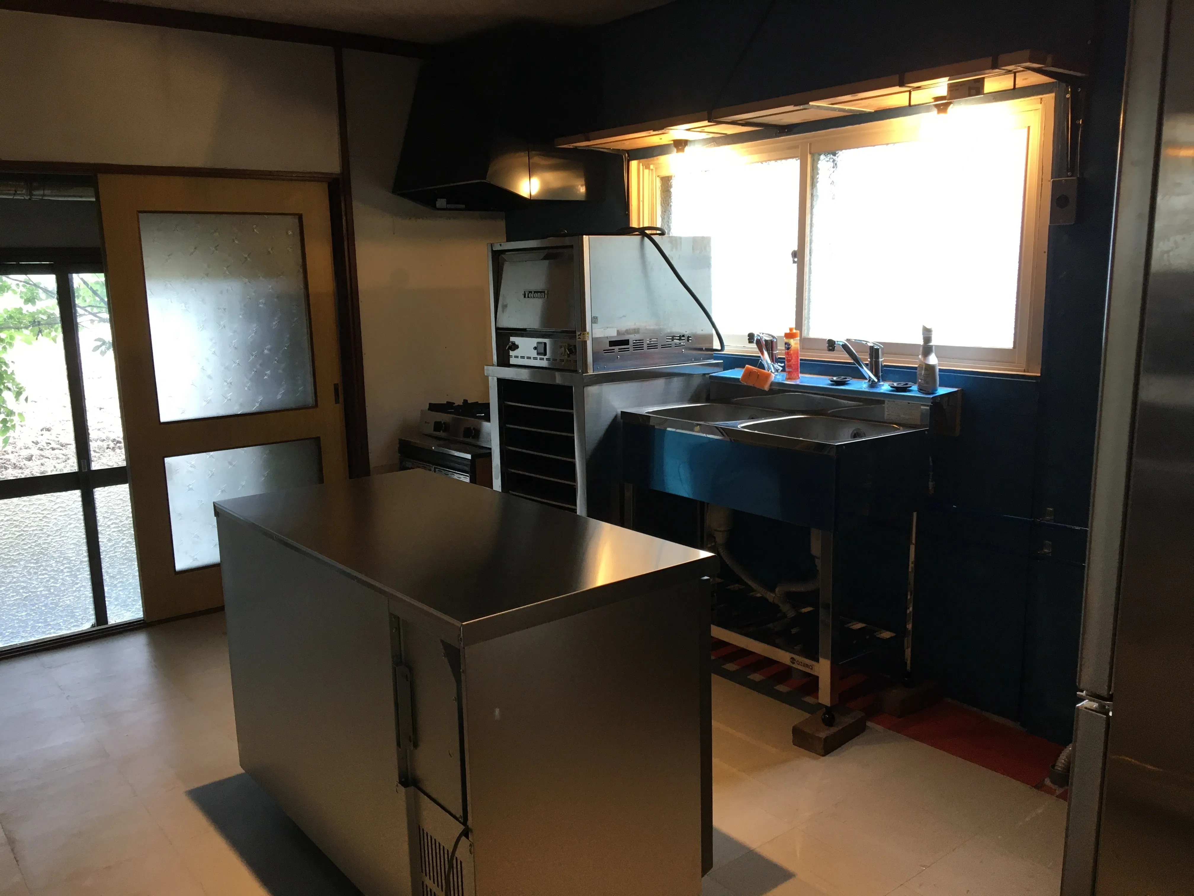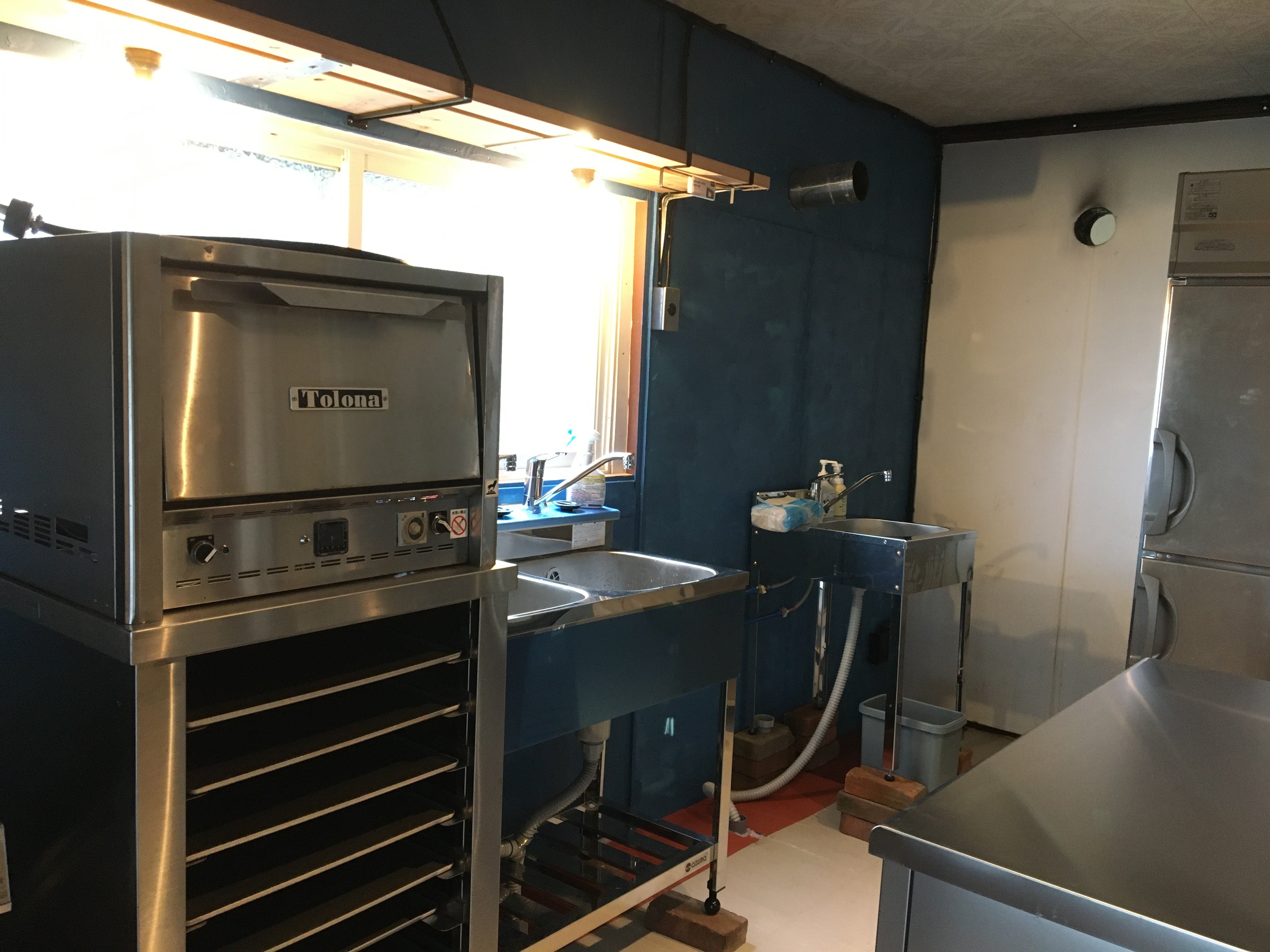 2ドア冷蔵庫、作業台付冷蔵庫、ピザオーブン、ガスコンロ、2層シンク、1層シンク