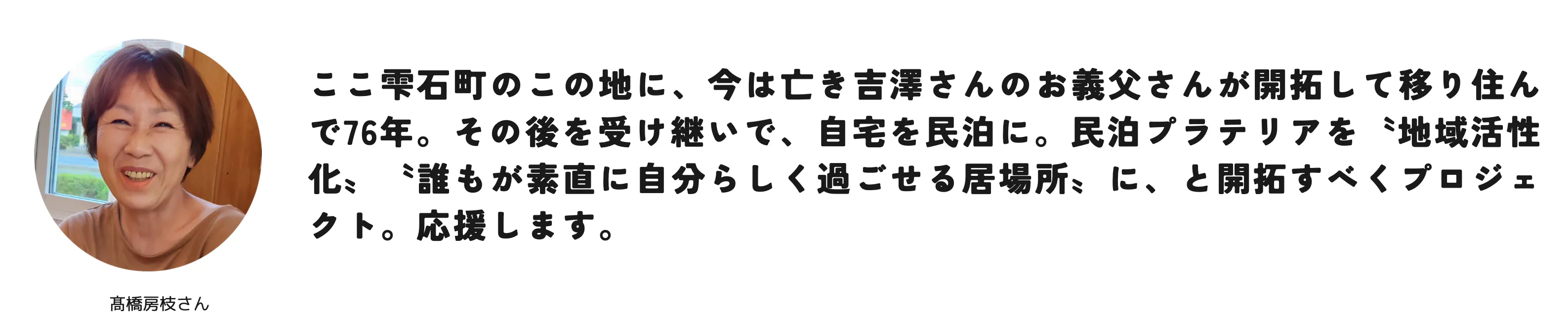 私は、この地域の良さをもっと多くの人に知ってもらい、民泊プラテリアが皆さんのハブとなり、