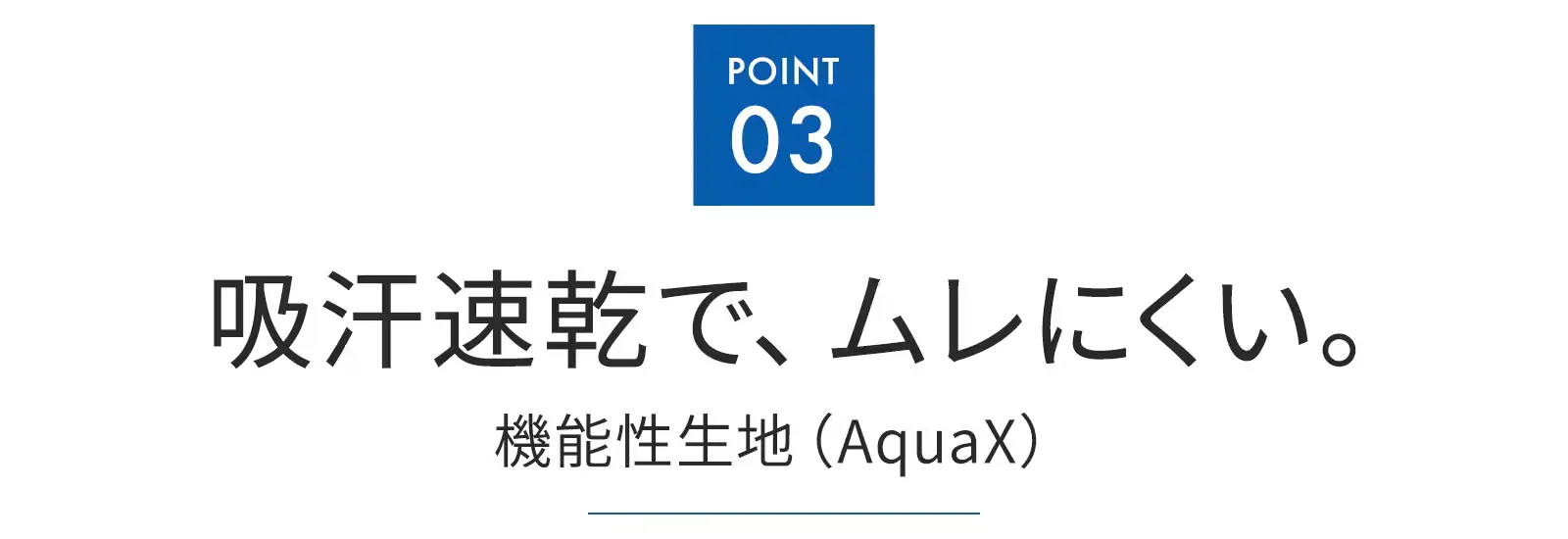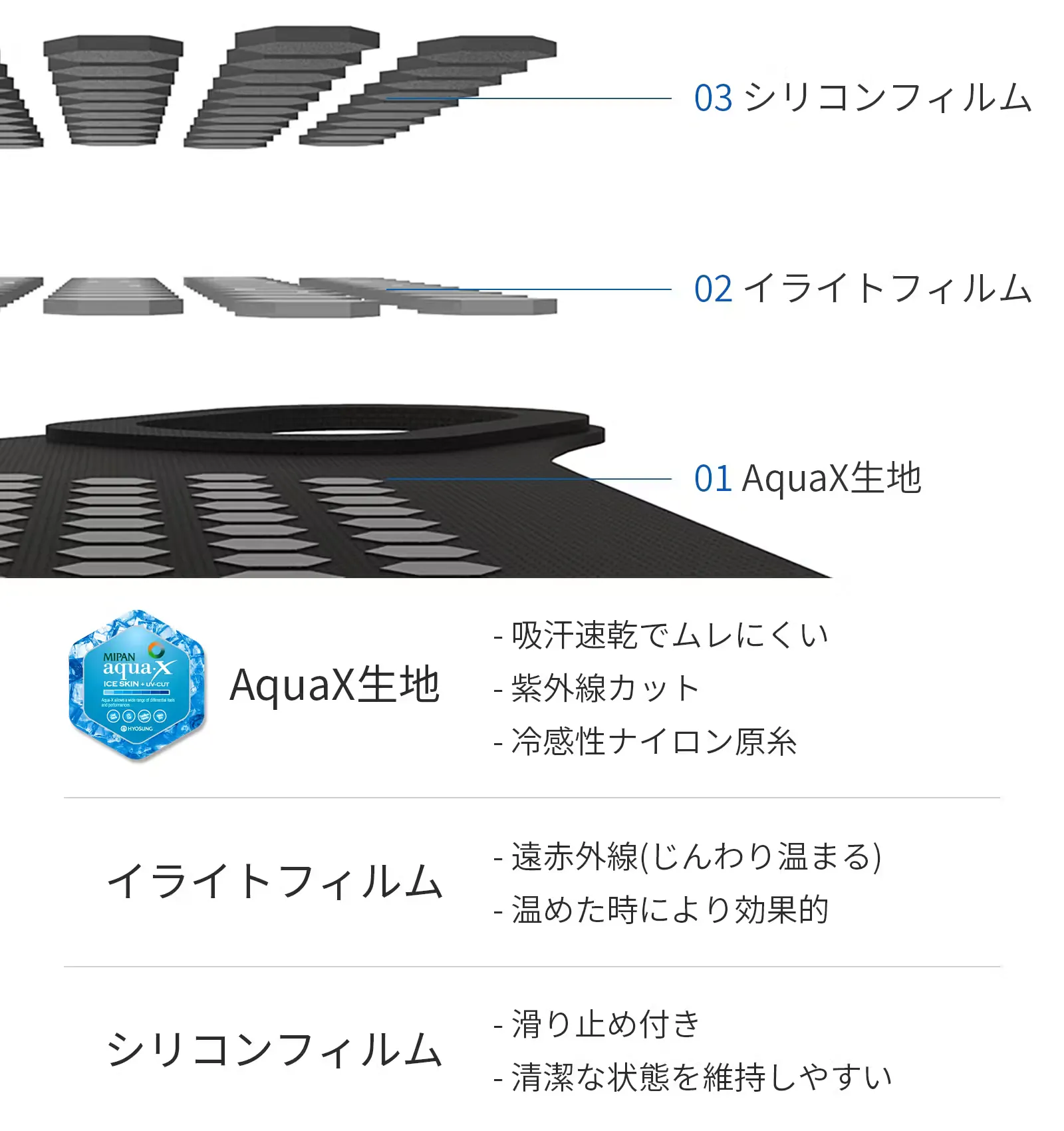 AquaX生地とは、素早く汗を吸収し、早く乾くことで季節に関係なく、1年中快適に使える優れた機能性生地です。紫外線をカットし、野外活動でも最適です。
