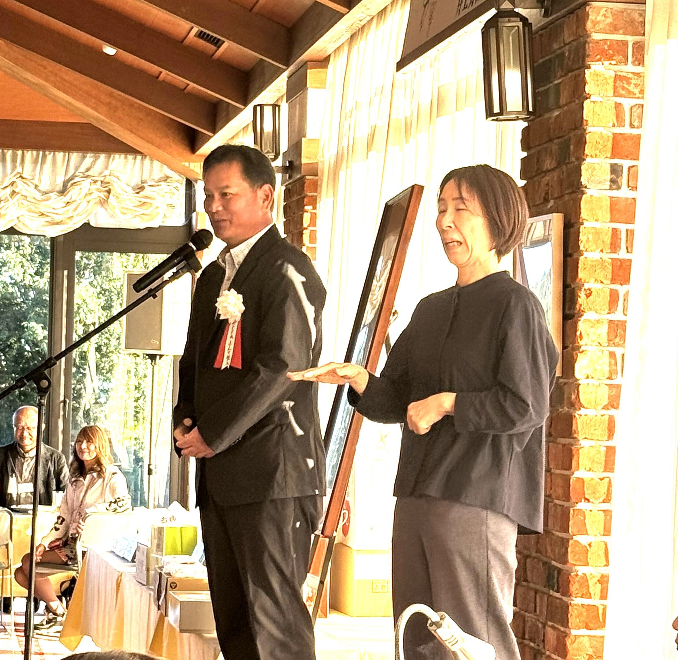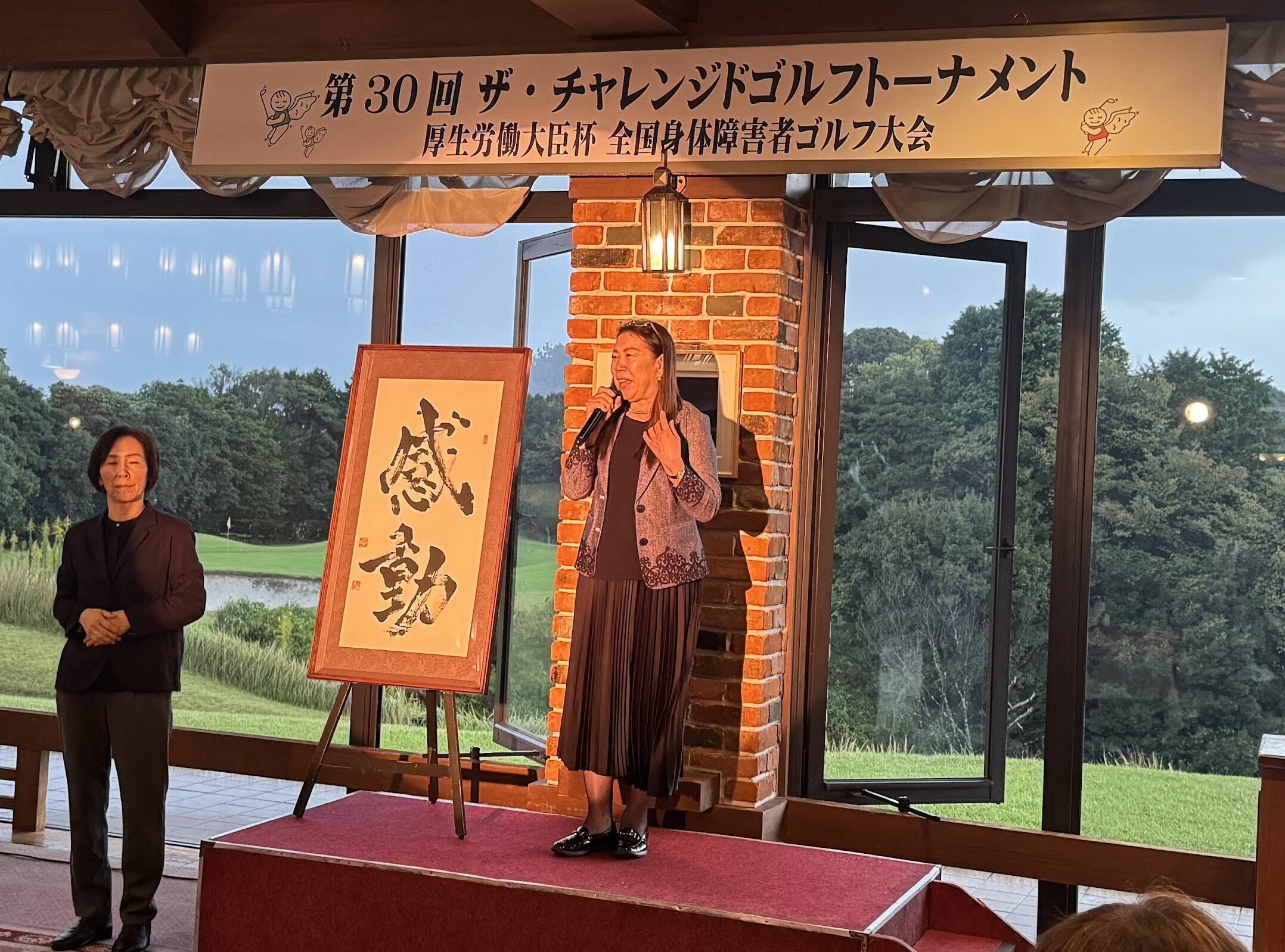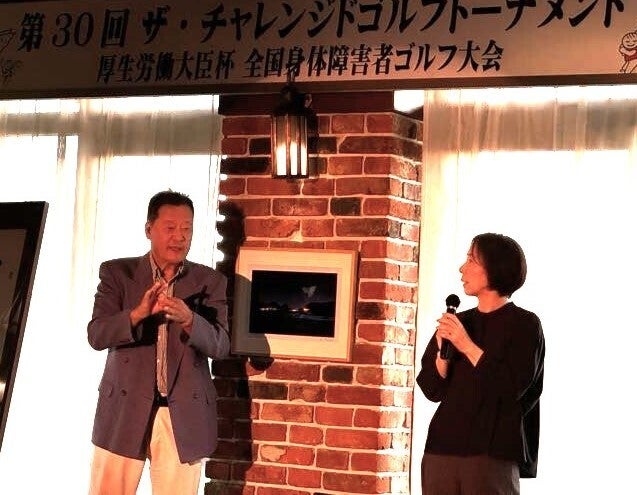 小池理事長の尊敬する雑誌「経済界」の主幹であり、政治ジャーナリストの佐藤正忠氏が、脳溢血で半身不随となり、それでも不屈の精神でゴルフをはじめられました。そのゴルフの師匠が片腕のプロゴルファー山手勝プロでした。佐藤氏より山手プロを紹介いただき、「全国に多くの障害者が家に閉じこもっている状況です。そんな障害者にゴルフ場を開放してほしい!」とのプロの話から、大会開催を決意。佐藤氏は他界されていますが、今回30回大会ということもあり、佐藤氏のご令嬢で株式会社経済界の代表取締役である佐藤有美氏にご来場いただき、ご挨拶をいただきました。