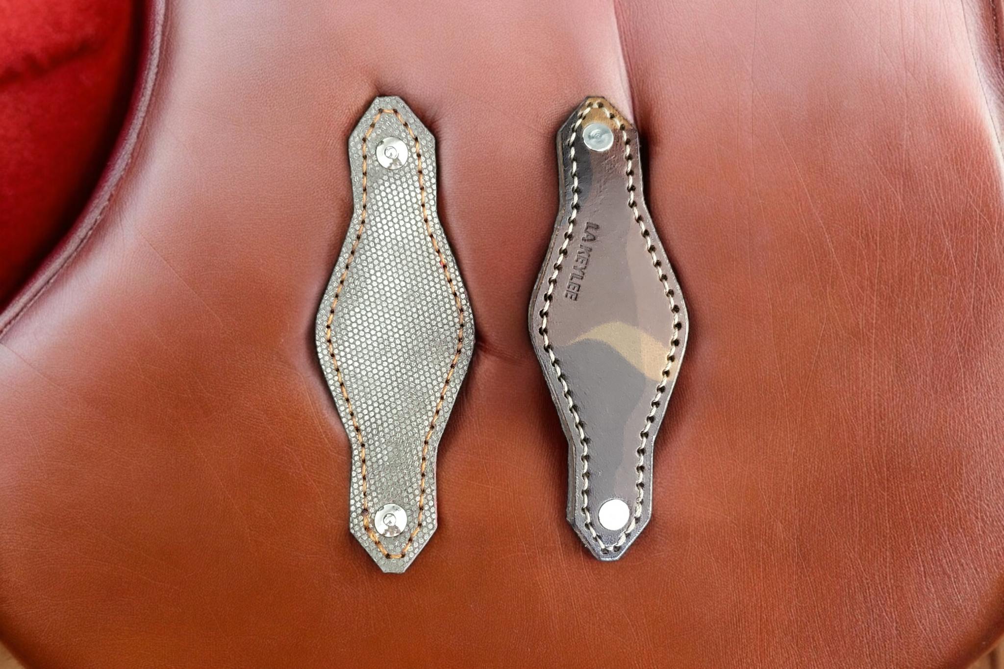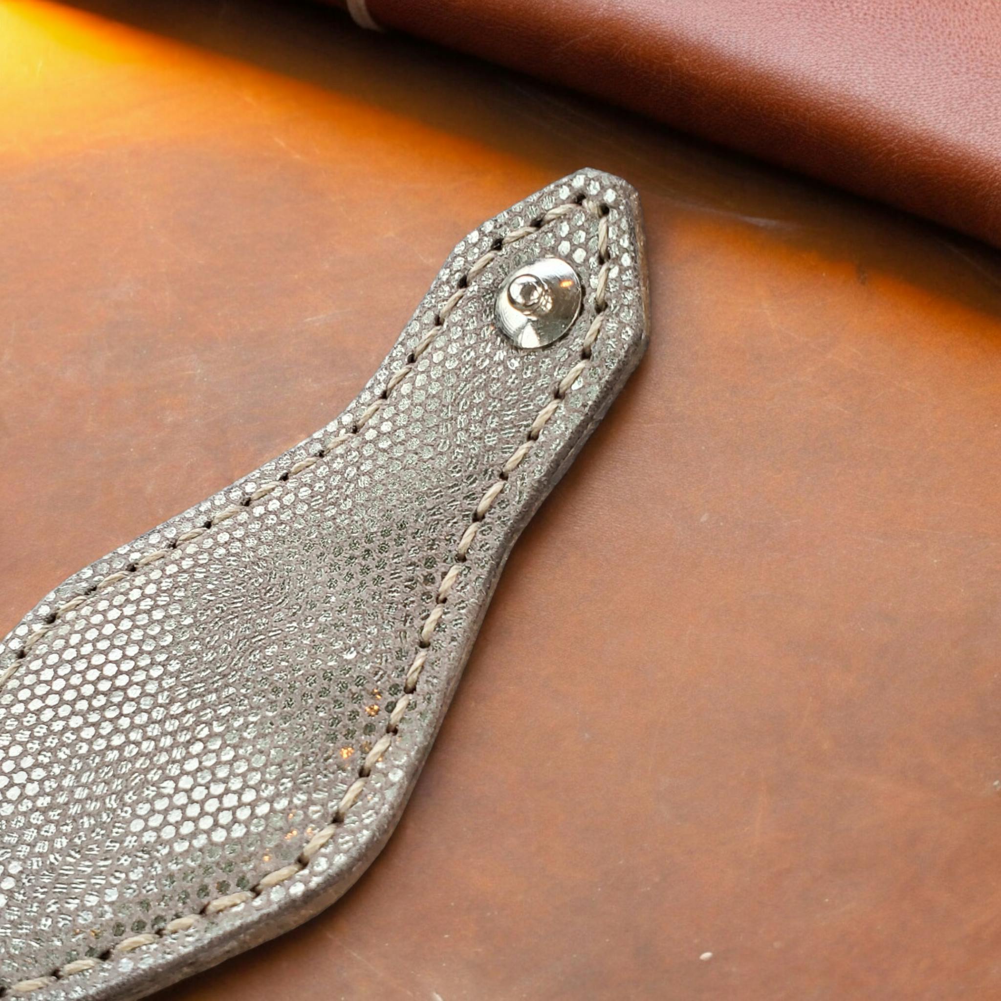 裏面はシルバードットの加工が施された牛革を使用しております。この素材は鎖帷子のような力強い印象とメタリックのような光沢を放ちます。