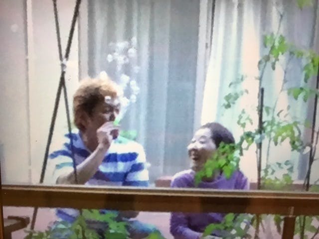 ↓ 母親とシャボン玉を楽しむ様子 特別養護老人ホーム中庭
