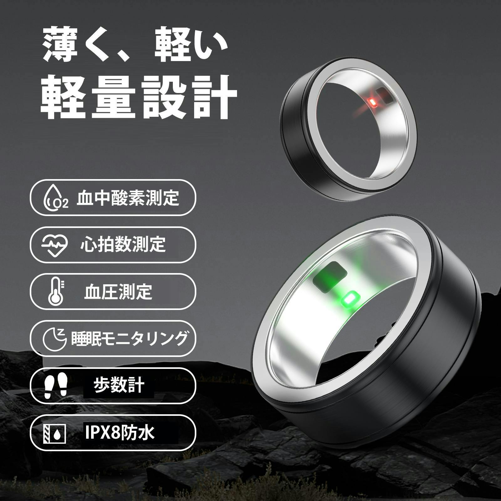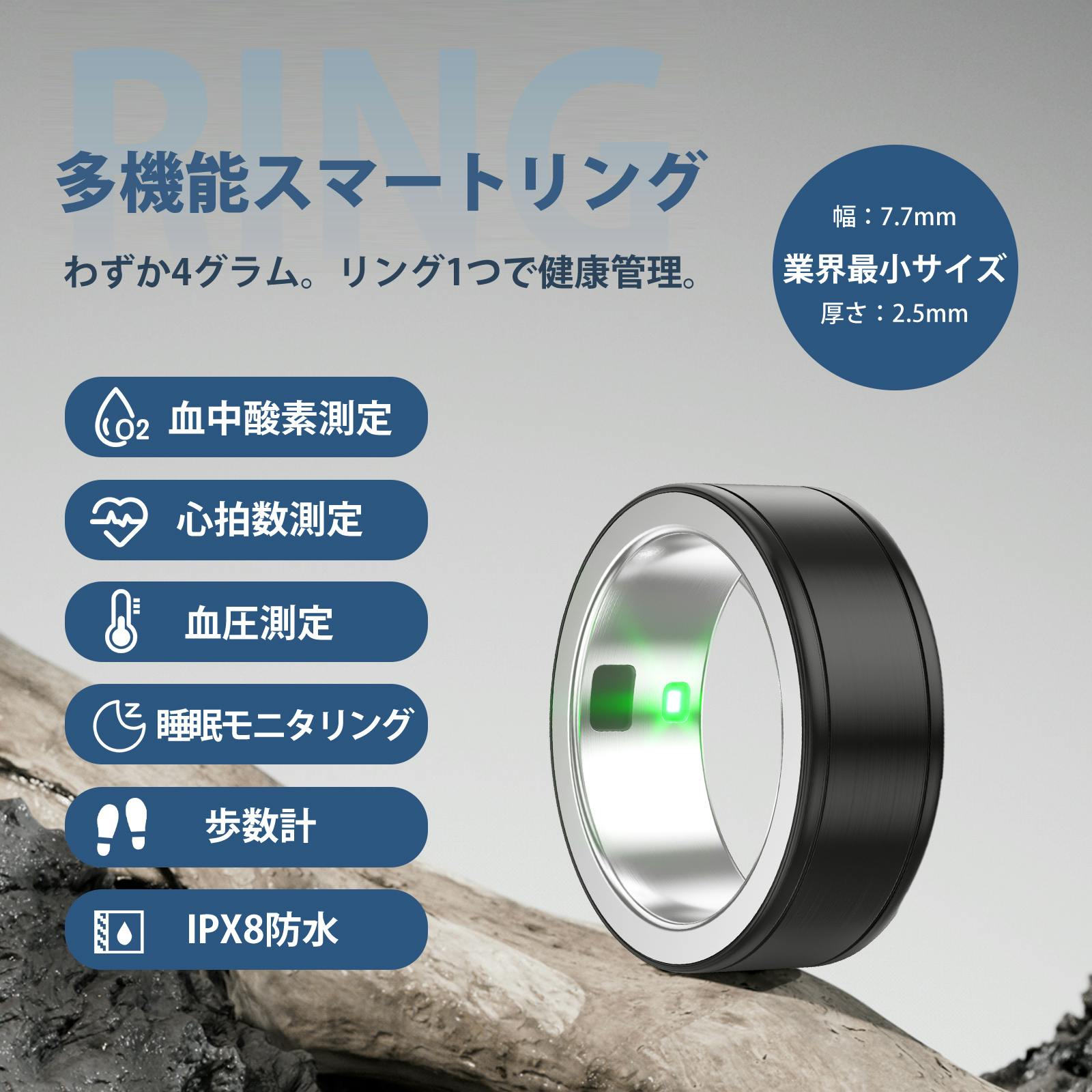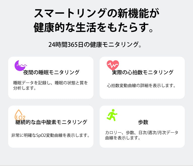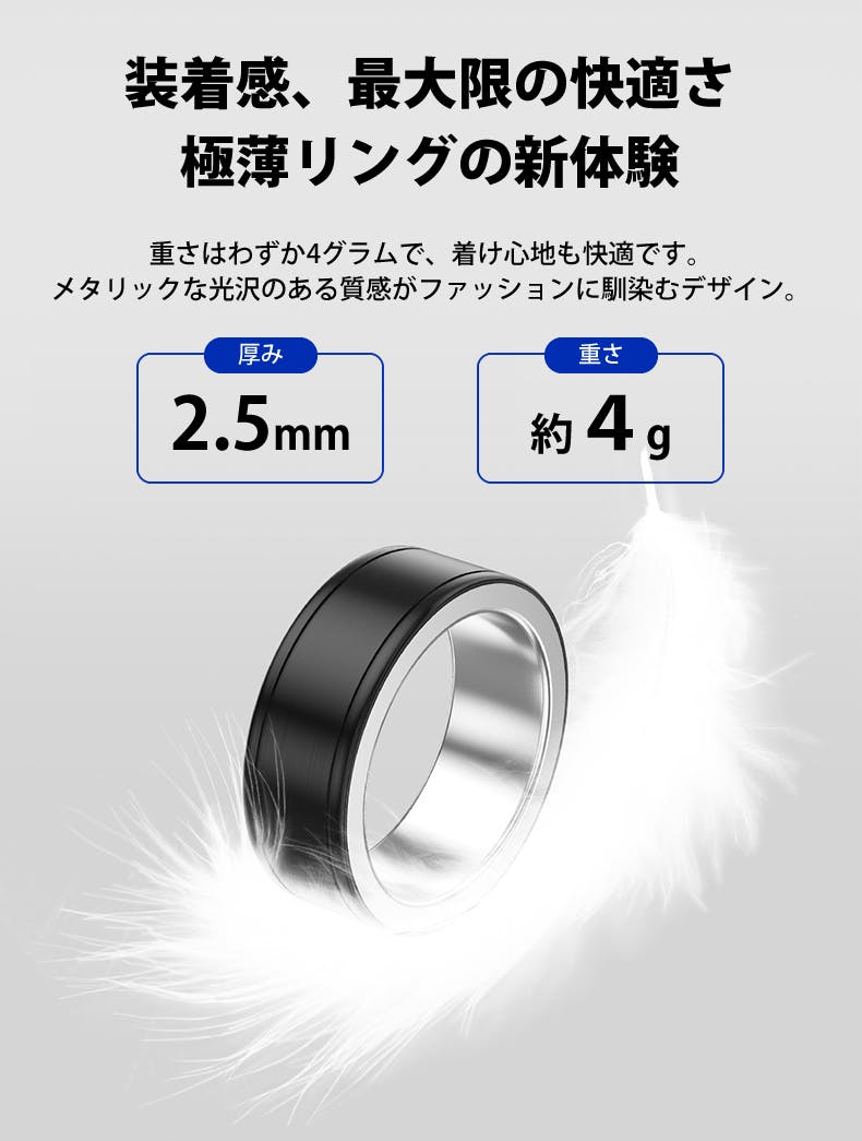 このスマートリングは、日々の生活に自然に溶け込み、健康管理を簡単かつ効果的にサポートします。忙しい日々の中でも、健康をしっかりと守るために、ぜひこのスマートリングを活用してください。