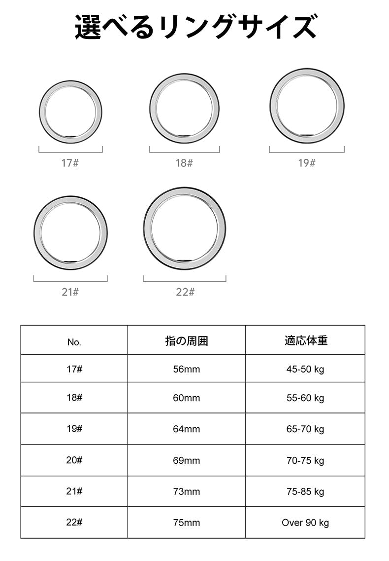 フィットするサイズ展開: 様々な指のサイズに対応する複数のサイズ展開で、ぴったりのフィット感を提供。