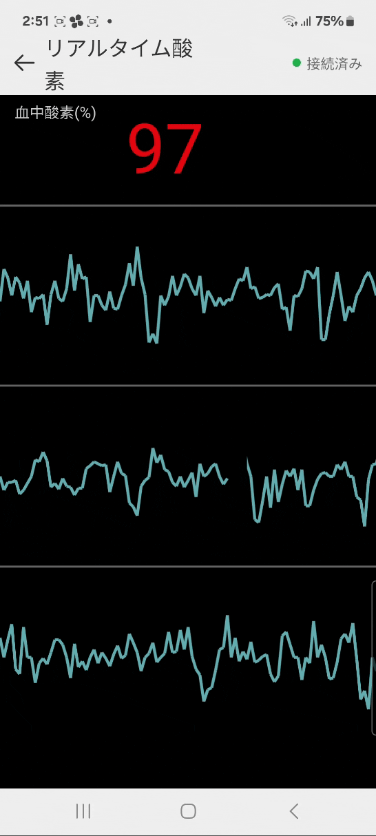 リアルタイム波形表示: 心拍数と血中酸素のリアルタイム波形でわかりやすく表示。