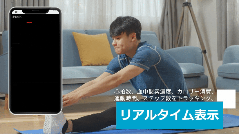 A: 心拍数、血中酸素濃度、カロリー消費量、運動時間、ステップ数をリアルタイムでトラッキングできます。