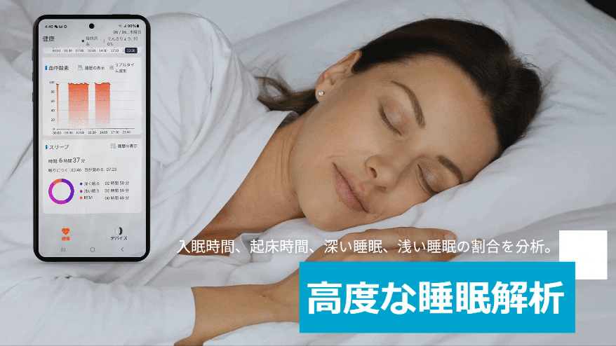 高度な睡眠解析: 睡眠サイクルの追跡が可能で、入眠時間、起床時間、合計睡眠時間、REM睡眠、深い睡眠、浅い睡眠の割合を分析。