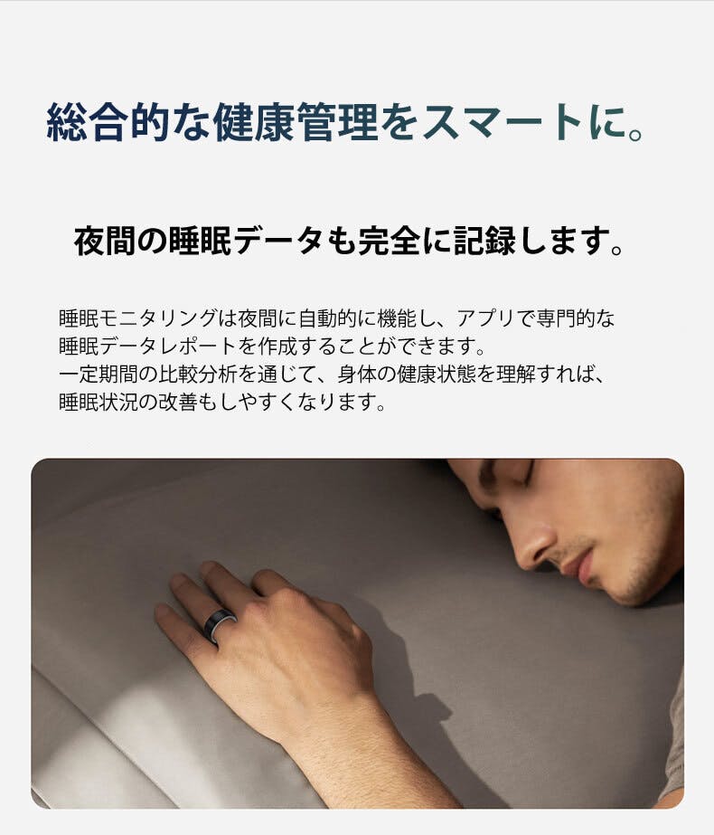 質の高い睡眠は日々の活力と健康の鍵です。そこで、このスマートリングがあなたの生活を大きく変える手助けをしてくれます。このスマートリングは、あなたの睡眠サイクルを詳細に追跡し、入眠時間、起床時間、合計睡眠時間、そして各睡眠ステージ(REM睡眠、深い睡眠、浅い睡眠)の割合を分析。これにより、あなたの睡眠パターンを正確に把握することができます。