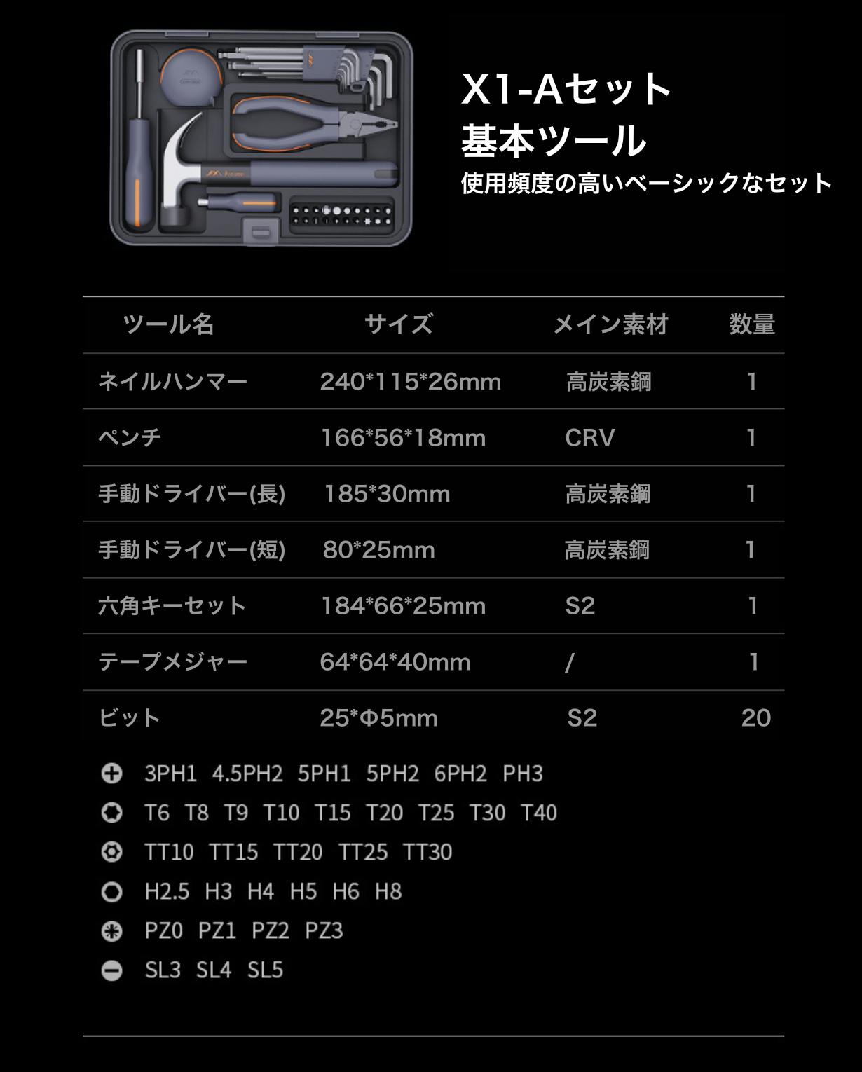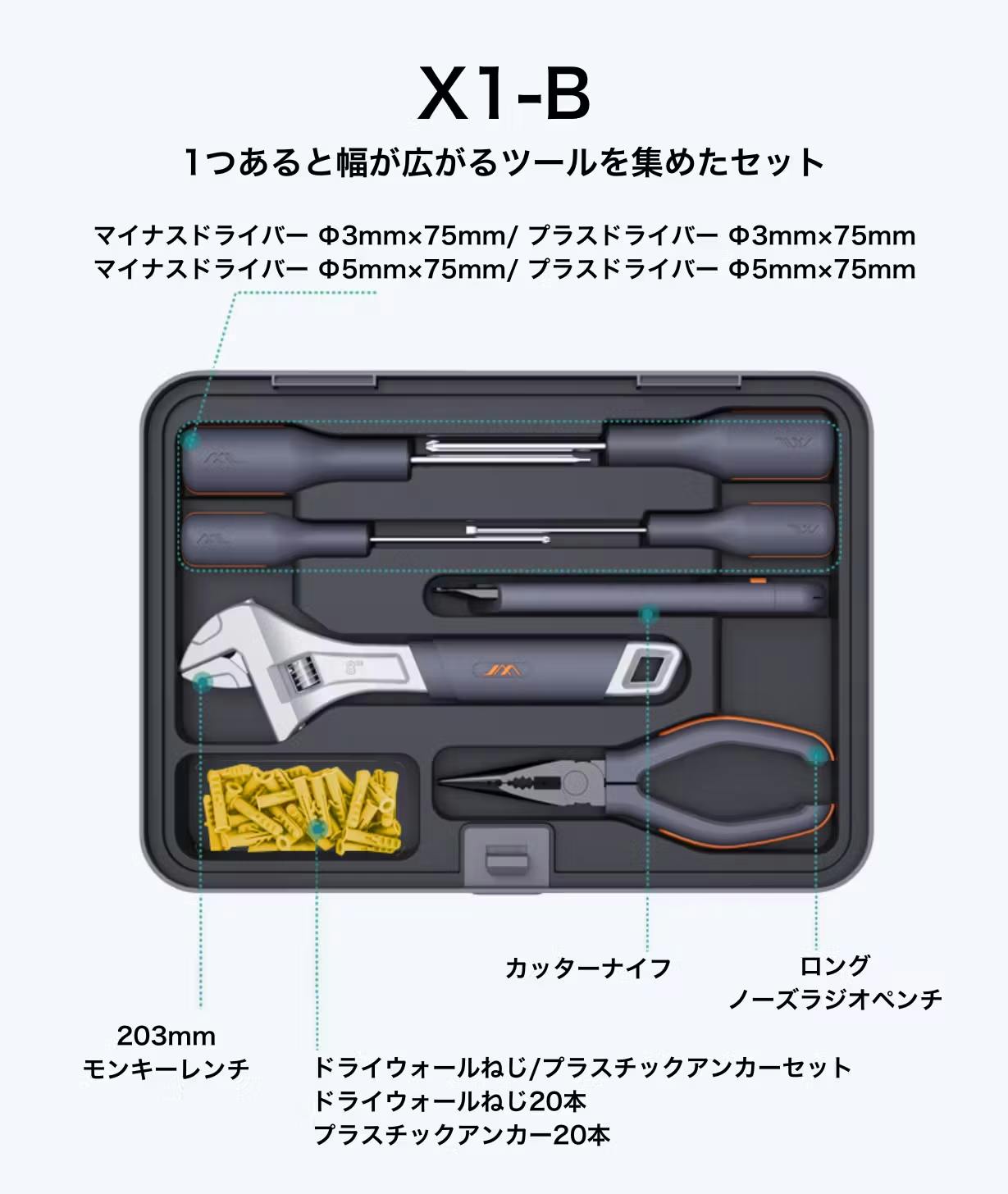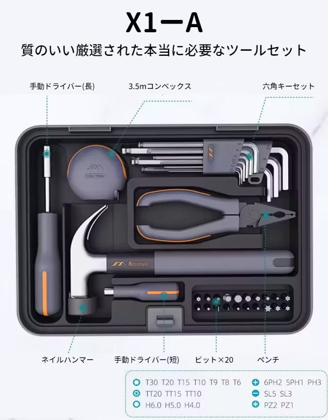 JIMIBOX X1-Aは、日常のDIYシーンで最も使用する基本的なツールを揃えました。