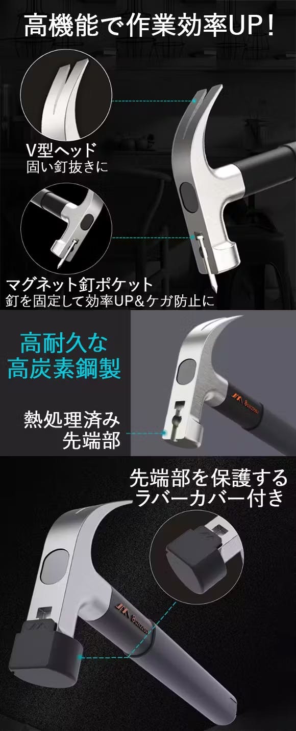 また、両手で作業できない狭い隙間や、高所へ釘を打ちたいときにも便利で作業効率が上がります。
