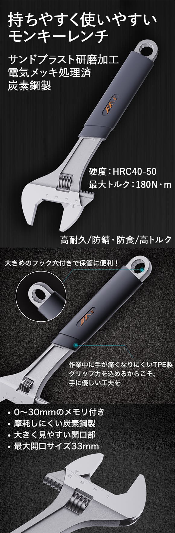 ハンドルはプラスチック製で軽く、金属部分はステンレス製で高耐久です。