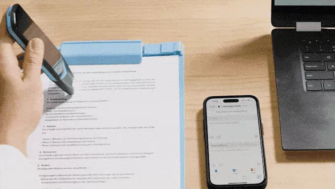 スキャンペンをスライドさせるだけで、瞬時に文字起こししたテキストがPCやスマートフォンの画面に表示。追加のソフトウェアは必要なく、ペンのQRコードをスキャンするだけで、スキャンされたテキストを同時にスマートフォンやPCで表示できます。