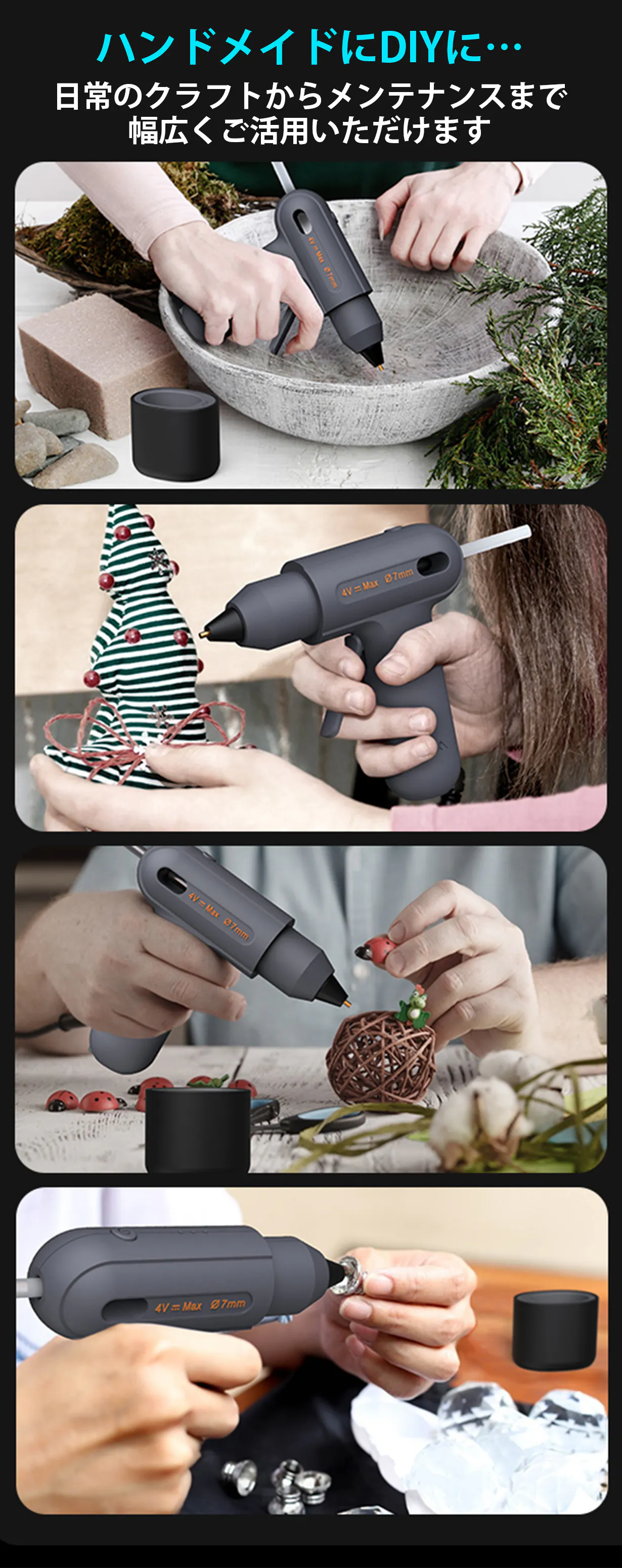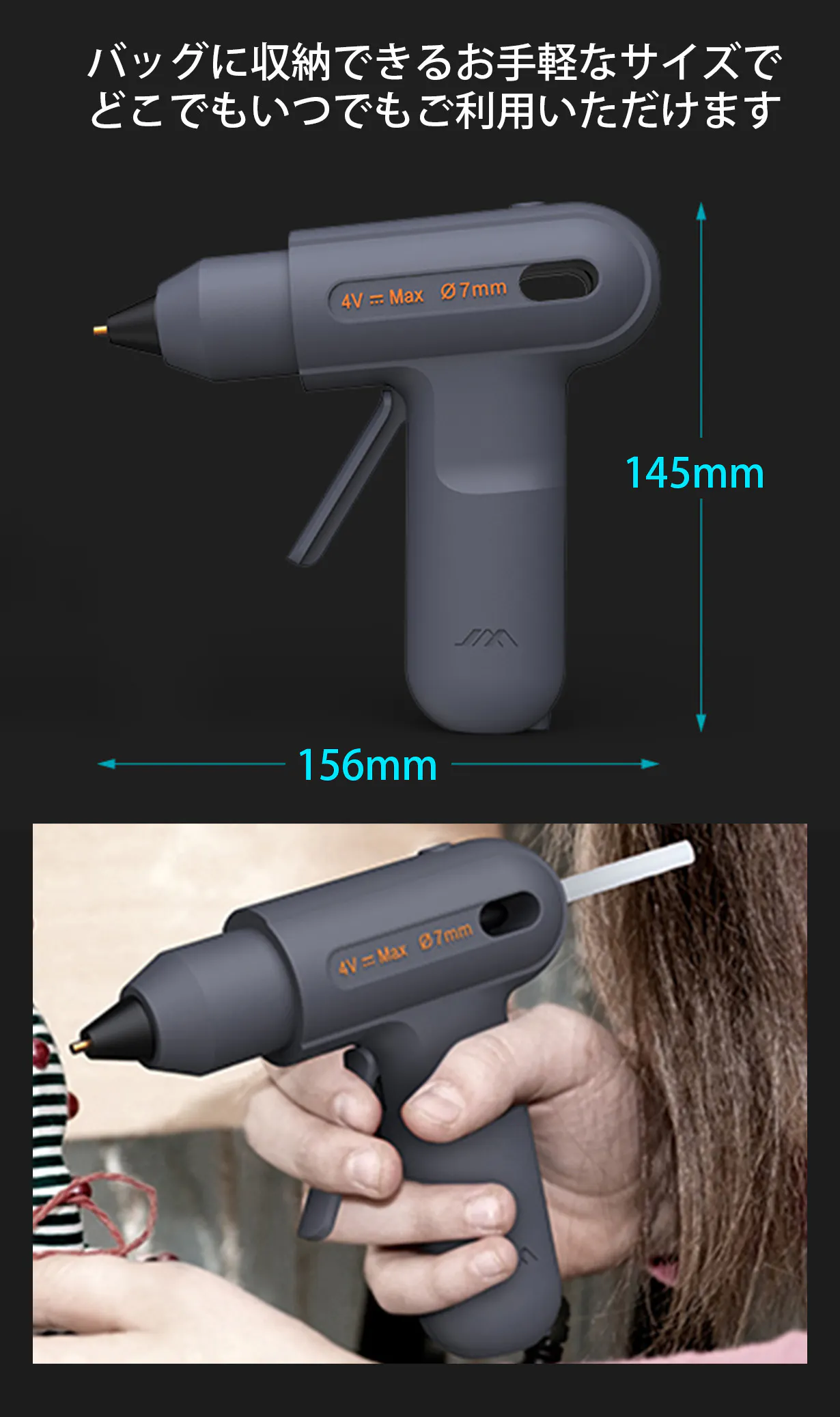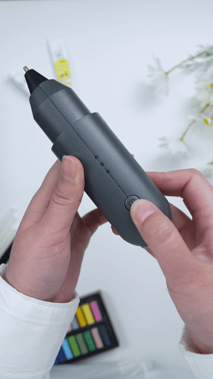 JIMI GLUE GUNはハンドメイドやDIYで欠かせない接着作業に最適な接着用ツール。電熱式のグルーガンと聞くと、火傷や扱いに注意しなければならない敷居の高い工具のようなイメージをお持ちの方もいらっしゃるかと思いますが、お子様と一緒でも使っていただけるシーンを想定して、火傷防止など安全面に配慮し、シンプルな操作設計にしました。