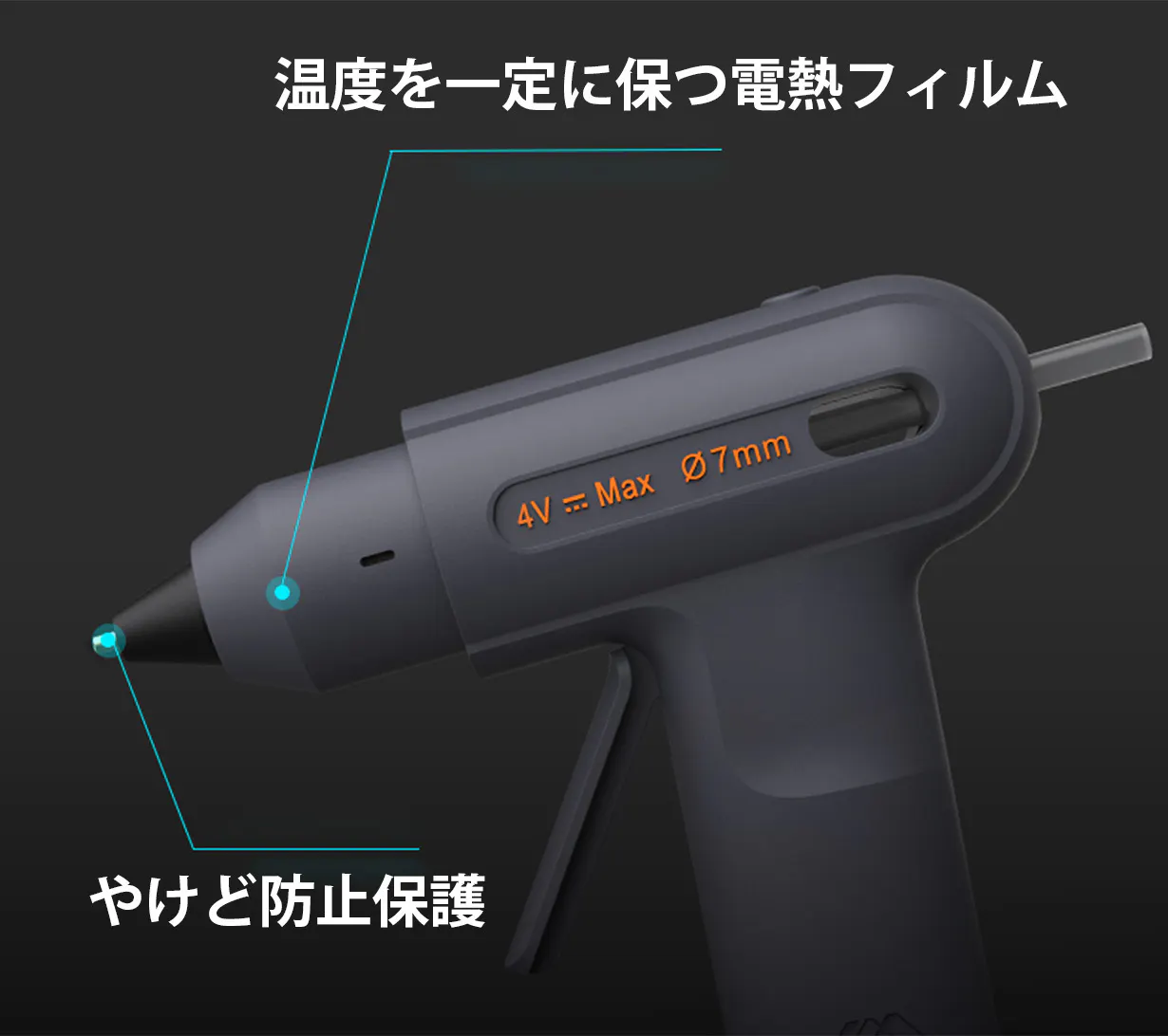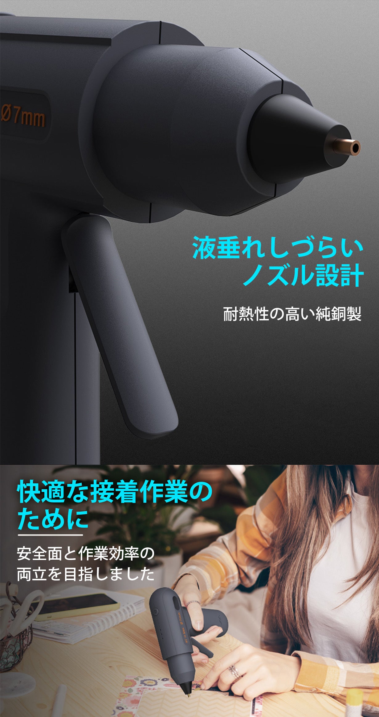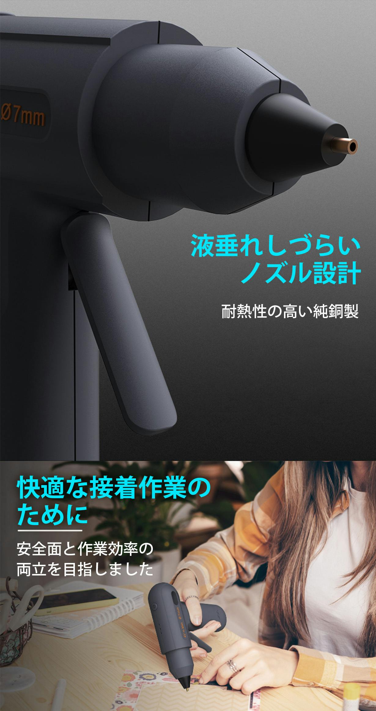 また、ノズルの素材には純銅が使用されているために加熱効率が良く、より安定した温度を保って接着剤をしっかり溶かし、スムーズに出すことができます。