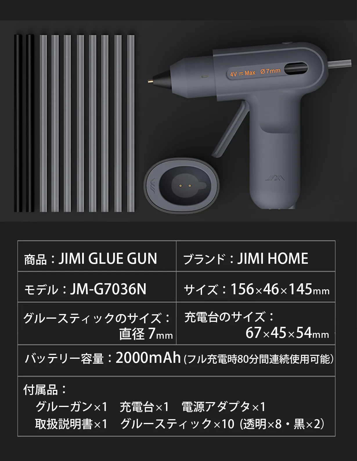 2000mAhのバッテリー容量により、フル充電後80分間の連続使用が可能です。