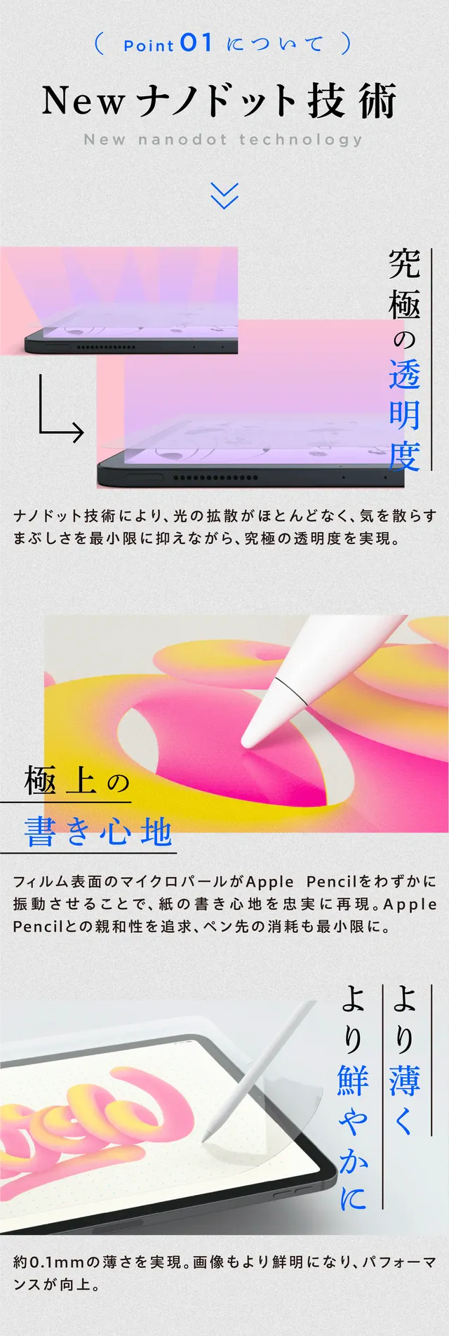 フィルム表面に、進化したナノドット技術でマイクロパールを均一に並べることで紙のざらざらした質感を再現。ペン先が滑りにくくなり、書きやすさも向上。
