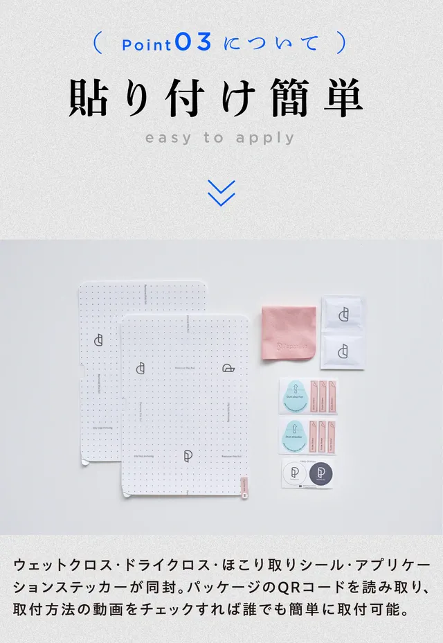 ウェットクロスやほこり取りシール・アプリケーションステッカー等が同封されているので、気泡や細かいゴミも入りにくく、初心者でも簡単にきれいな貼り付けが可能に。