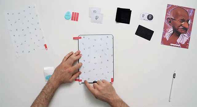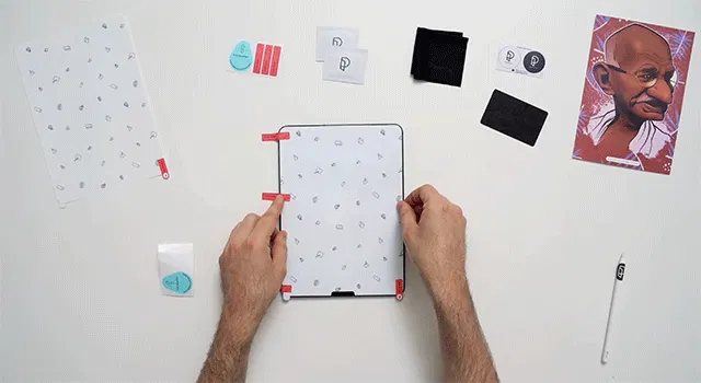 PaperlikeをiPadの上に乗せて、ガイドのアプリケーションステッカーを貼り付ける