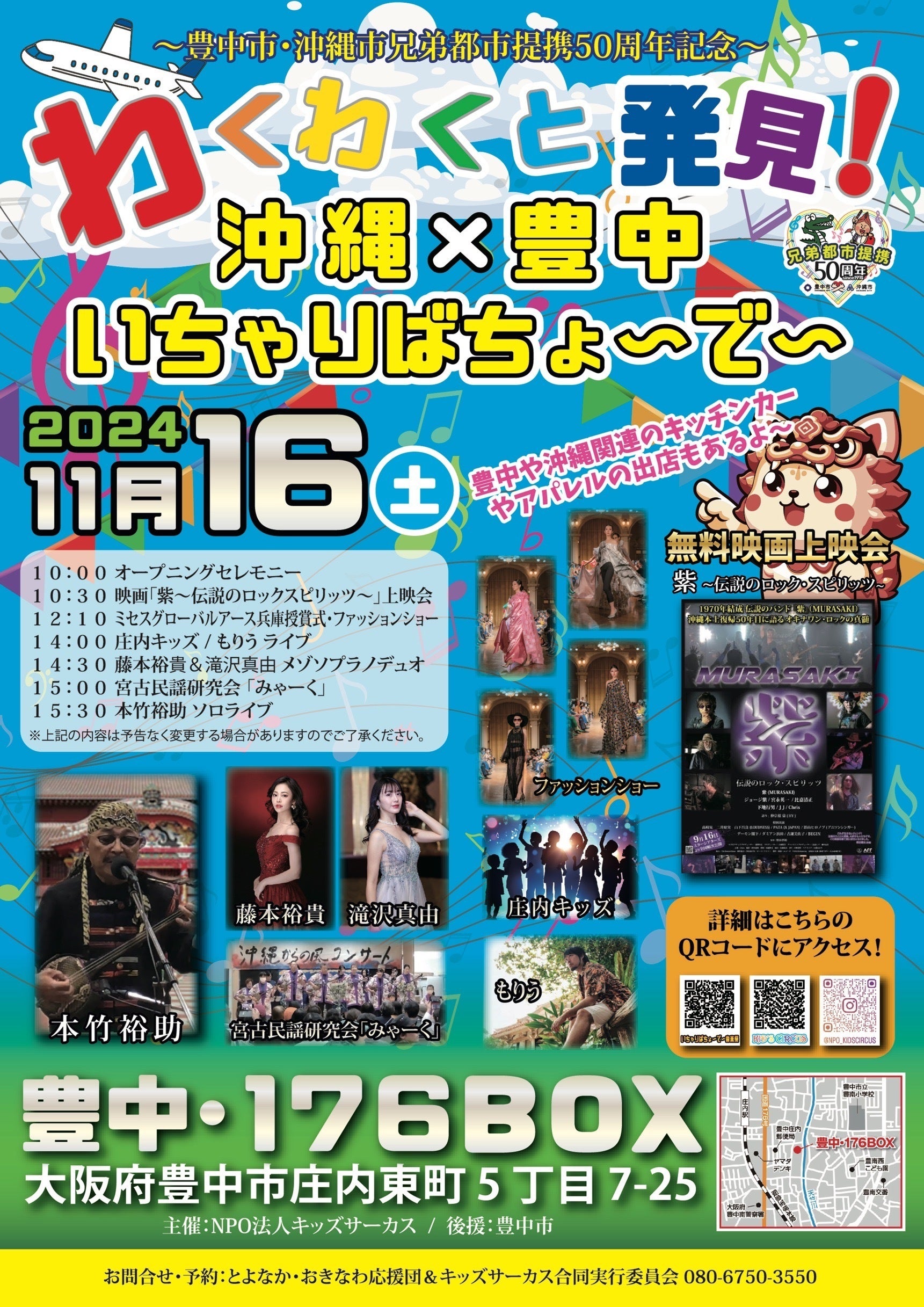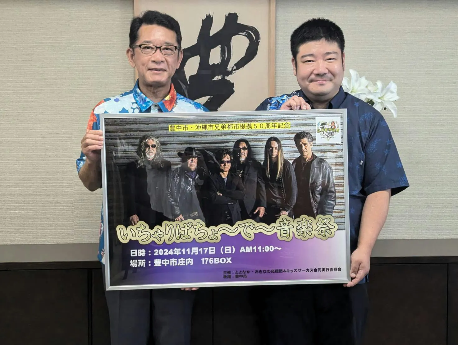 今秋、豊中市庄内エリアで「いちゃりばちょーでー音楽祭(おんらくさい)」という沖縄&豊中の音を楽しむイベントを開催にあたり、大阪府豊中市の「NPO法人とよなか・おきなわ応援団」、「特例認定NPO法人キッズサーカス」両団体による合同実行委員会です。名誉会長には豊中市長、沖縄市長に就任して頂き、既に令和6年8月9日・10日 沖縄市役所ロビーコンサート、沖縄こどもの国コンサートを記念イベントとして(合同委員会共催・後援:豊中市・沖縄市)「わくわくと発見 !沖縄・豊中いちゃりばちょーでー」を開催致しました。