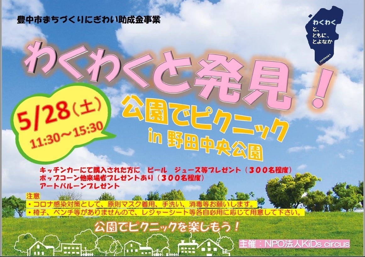 豊中市 野田中央公園にてキッチンカーや野外コンサートなどを行い、コロナ禍でも楽しめる内容のイベントを開催した。