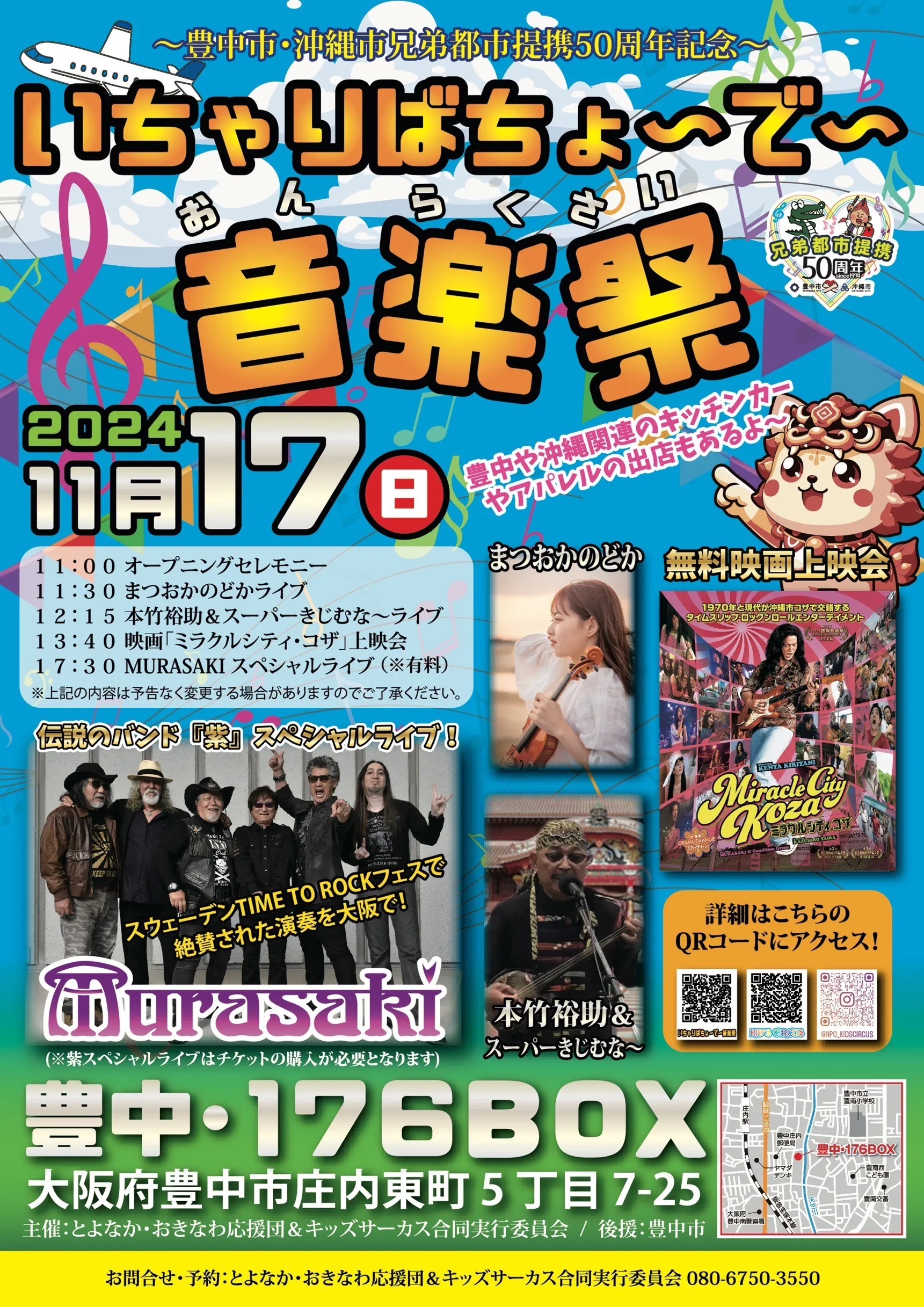 2024年11月17日に豊中市庄内にある「176BOX」で「いちゃりばちょーでー音楽祭」沖縄を音楽と映像で体感できるイベントです。