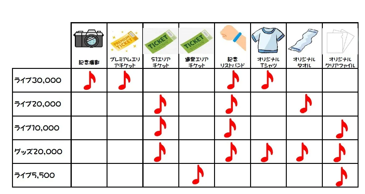 20,000円コース・・・ライブチケット(S1エリア)1枚入場オリジナルリストバンドイベント記念タオル