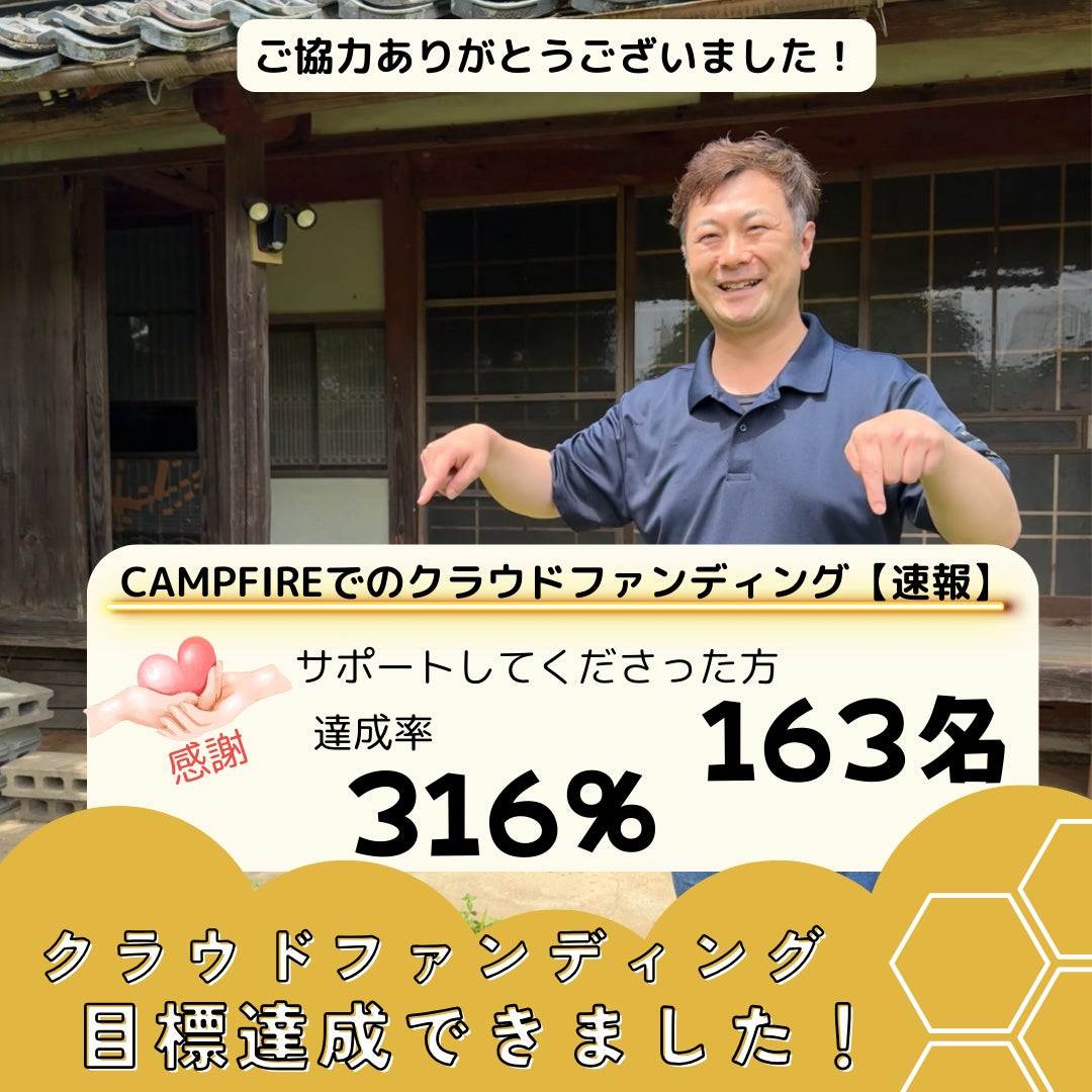 2024/08/06 04:502024年8月3日(土)をもちまして、CAMPFIREで実施しておりましたクラウドファンディングの支援募集は終了いたしました。皆様の温かいご支援のおかげで目標達成316%(1,580,000円)という結果で終了致しました。誠にありがとうございました。準備に手間取り、審査に苦戦し、とても大変でしたが、このような結果を得られたのも、ご支援くださった皆様、様々な応援のお言葉をお寄せいただきました皆様、本クラウドファンディングをSNS等で広く発信してくださった皆様、実際に店舗を訪れてくださった皆様のおかげです。心よりお礼申し上げます。ご支援をいただきました皆様のお気持ちにお応えできるよう、集まった資金は縁側を使ったオープンカフェや古民家はちみつレストランの開設に向けて必要な古民家の改装工事ために大切に活用させていただきます。【リターンの発送】皆様への返礼品につきましては、順次発送を予定しております。現在、まだ農繁期のため、また、ありがたいことに想定以上のご支援を賜りまして、すぐにお送り差し上げたいのですが、少々お時間をいただく場合がございます。ご了承ください。なお、ミールチケット(お食事券)は、古民家レストランやキッチンカーでご使用いただけますが、商品券として店舗でのお買い物ではご利用いただけません。ご注意ください。改めて、当初の目標を316%も上回るご支援をいただけたこと、私どもの目指す未来の社会づくりに賛同していたけたこと、ご支援、シェア、ご協力、応援いただけたこと、感謝申し上げます。ありがとうございます。それだけ食文化やケミカルフリーの循環型農法への期待の高さを感じ、身の引き締まる思いです。今後のプロジェクトの最新状況は主にインスタグラムやホームページで配信して参ります。ときつ養蜂園は、農薬や化学肥料を一切使わず、循環型農業で自給自足の生活を目指しています。今後はこの古民家はちみつレストランを地域の拠点のひとつとして活用しつつ、引き続き、人にも、自然にも、ミツバチにも優しい環境づくりを進めながら持続可能な社会づくりの実現に取り組んで参ります。今後とも、応援、ご支援のほどよろしくお願いいたします。 もっと見る