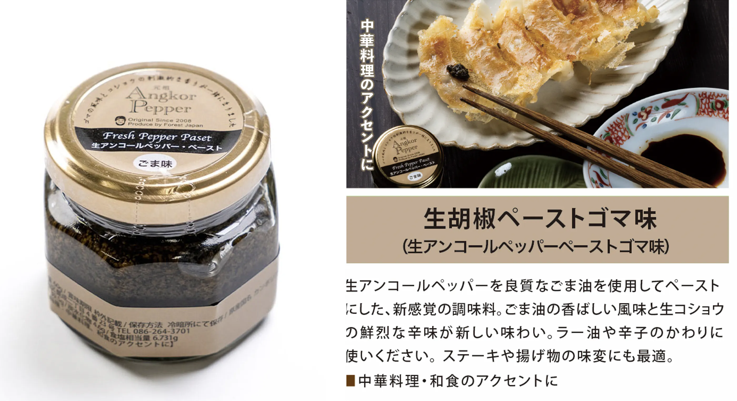 生アンコールペッパーを良質なごま油を使用してペーストにした、新感覚の調味料。ごま油の香ばしい風味と生コショウの鮮烈な辛味が新しい味わいです。ラー油や辛子のかわりにお使いください。ステーキや揚げ物の味変にも最適です。