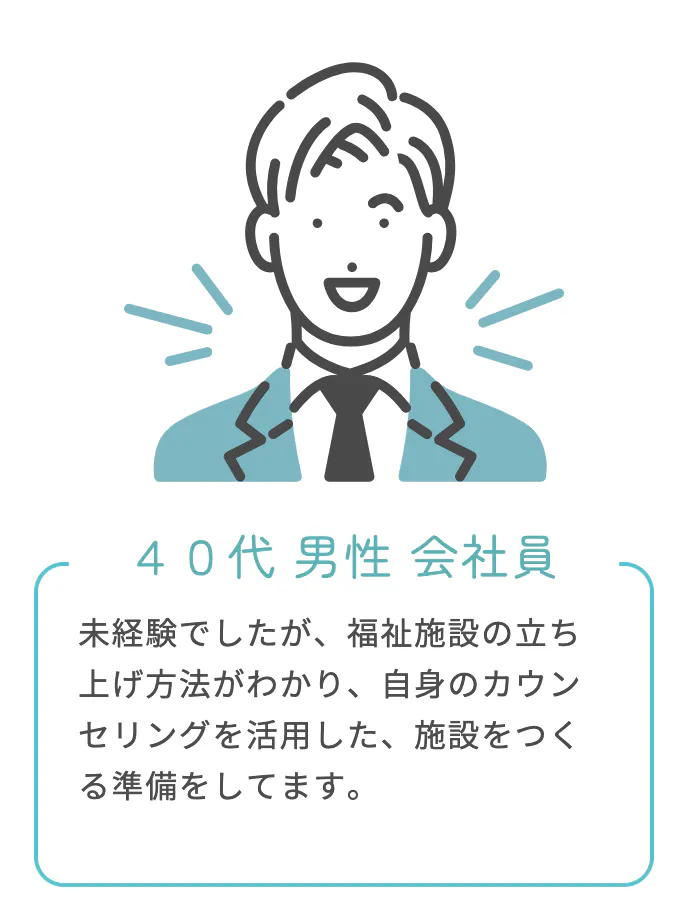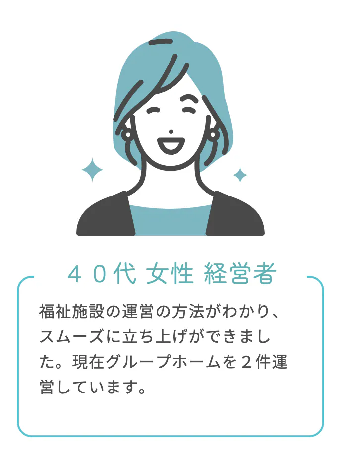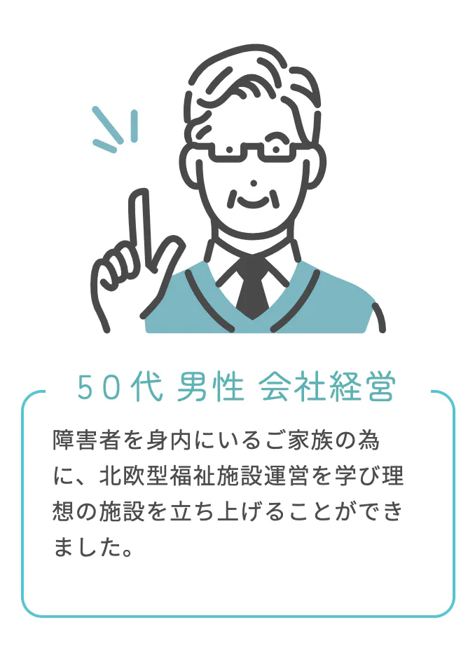 50歳からの挑戦ですが、事業立ち上げと運営ノウハウ、そして伴走型のサポートを実現しながら小資本・低コストで参入できる仕組みを整えました。今も、将来も、障がい者本人もご家族の方々も安心できる暮らしを提供するべく、残りの人生を賭けていきます。