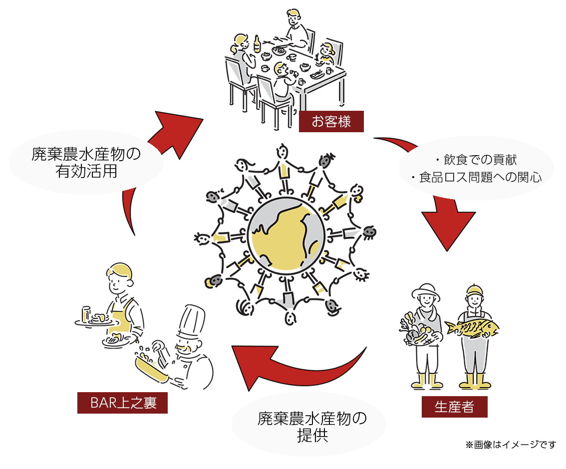 BAR上之裏で提供するメニューとして、廃棄される一次産品の活用や地産地消に取り組んでまいります。食べて・飲んで、社会に貢献できるような環境をつくってまいります。