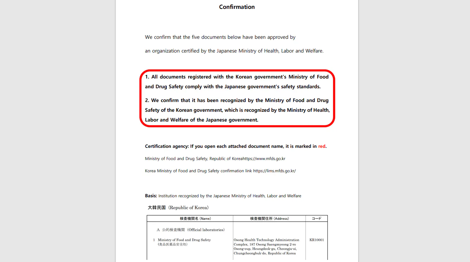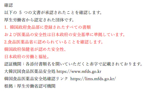 ※日本政府の厚生労働省指定の韓国現地自主検査機関の検査で、日本の食品衛生法の基準に合格している事が証明されております。