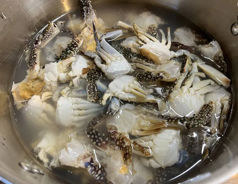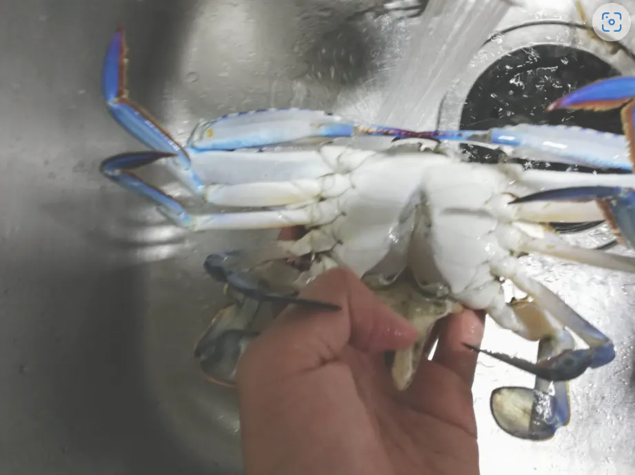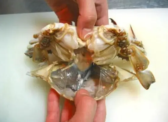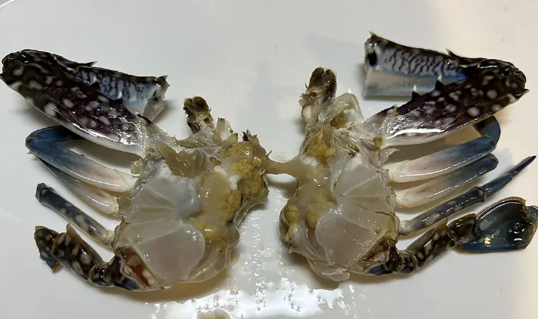 1.生きた渡り蟹をマイナス23℃に急冷、48時間後真水で自然解凍後、超音波洗浄します。