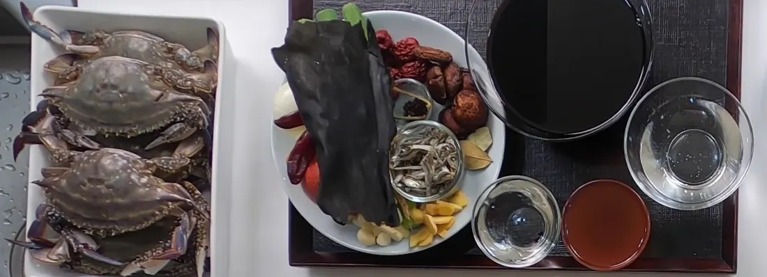4.煮沸醤油にカンポウなどの体にいいものばかりを配合した独自タレに蟹身を漬込む