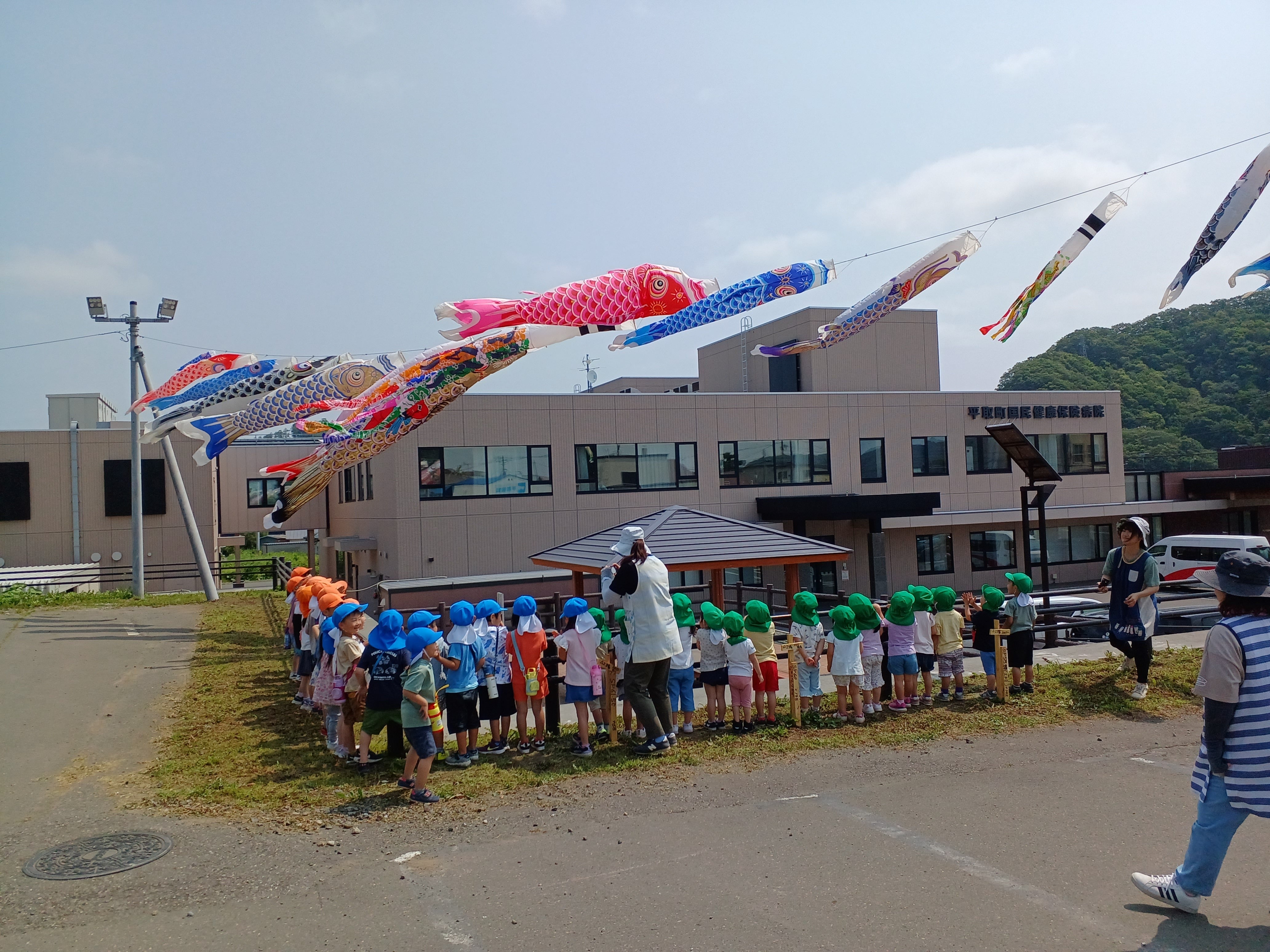 7月17日(水)、入院患者さんが病院から見守る中、隣接するバチラー保育園の園児も参加して、こいのぼりを掲揚しました。